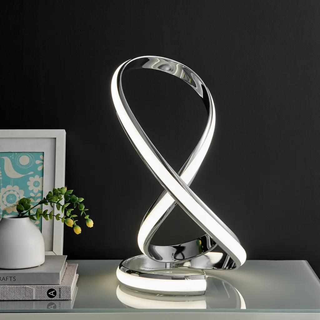 The Ellis Table Lamp in Chrome presents a captivating twist on lighting design, showcasing an intricate helix structure that makes a bold statement. Crafted with a lustrous chrome finish, this lamp creates an air of sophistication and futurism in any room. The light emitted from the LED strip is both efficient and powerful, capable of illuminating a space with a clear, consistent glow. With its sculptural form and reflective surface, the Ellis Table Lamp is a true blend of art and utility, ideal for those who appreciate contemporary design and innovative lighting solutions. This lamp features innovative touch functionality that allows for effortless operation—simply touch the switch to turn it on or off. Additionally, the lamp offers a dimming feature for creating the perfect ambiance for any occasion.