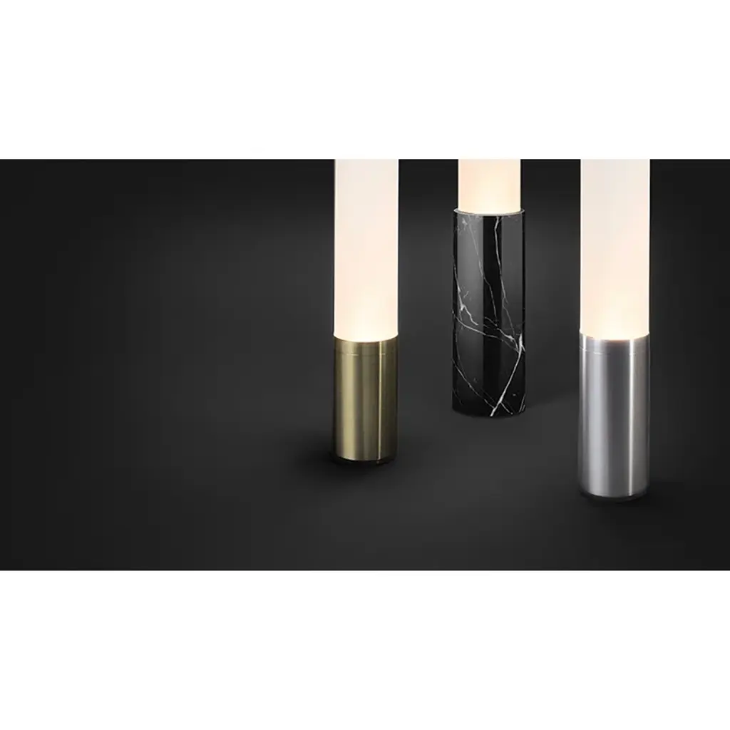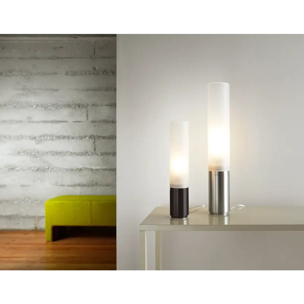 Elise is a conceptual tribute to the machine age: Streamlined, understated, and honest in its function as a light source. Celebrating the most classic of industrial forms, the cylinder, two elements compose the lamp: A refined aluminum base conceals the light source, providing ample ballast, while its towering frosted acrylic diffuser becomes a beacon of light. Its confident, geometric simplicity enables it to comfortably inhabit a diversity of spaces. Elise offers a full dimming range and is available in heights ranging from 12” to 18”.