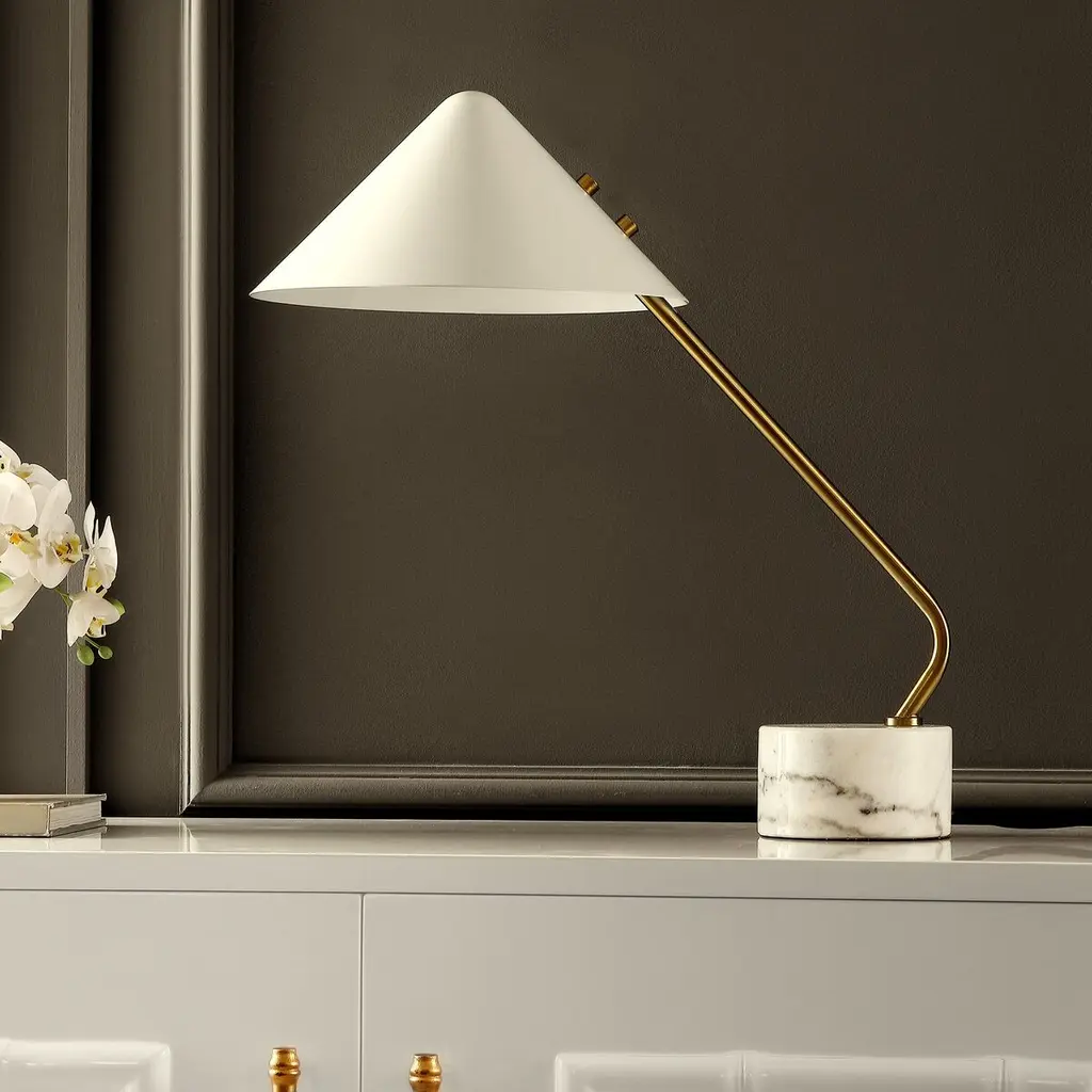 Add a dose of style to your tabletop with our refined and graceful table lamp. The refined and striking silhouette of the table lamp is accentuated with a masterful mix of materials. A curved, angular arm lends distinct charm to our contemporary lamp. It suspends an eye-catching tapered shade to make an impact. A marble base creates a beautiful contrast with the gleaming accents of our table lamp. Offering a soft and pleasant glow, our table lamp serves as a stylish and luxe accent for your bedside, console, desk, or end table.