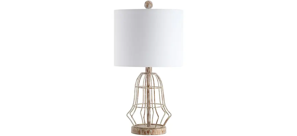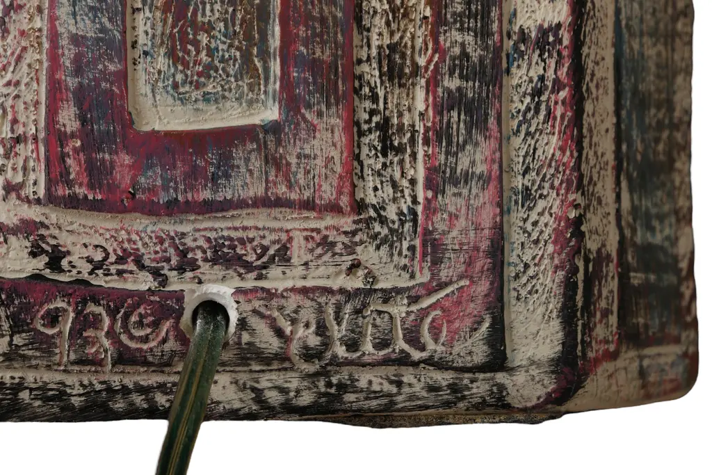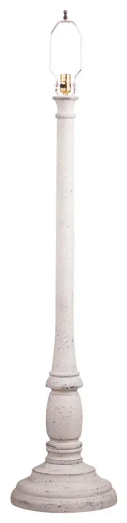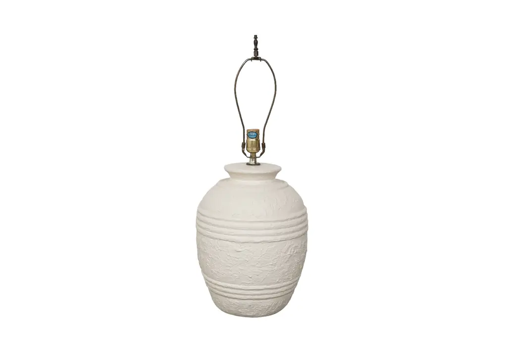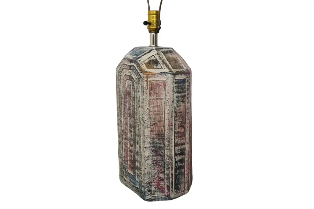 A mid-century modern chalkware table lamp by Elite 93. Decorated with geometric shapes brushed in purple, blue and gold over white. Signed 93 c Elite on the back. Measures 19.25"H to top of socket, 25"H to top of finial.