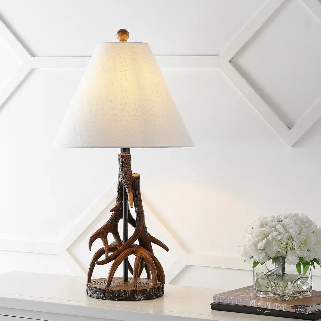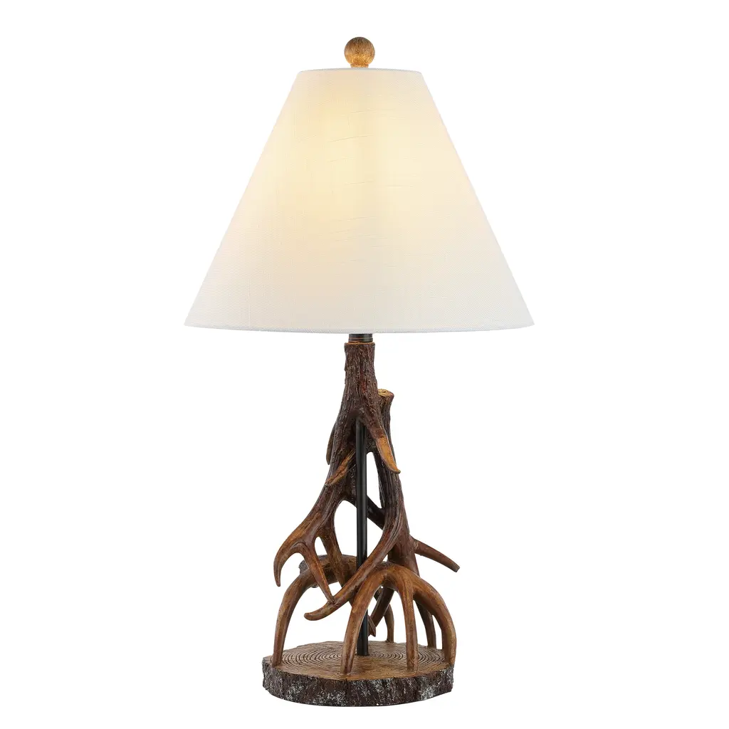 Inspired by summer camps and alpine holidays, our rustic antler lamp features faux antlers standing on a slice of wood, all made from durable resin. This charming lamp's natural finish is complemented by a hardback fabric shade and bright LED bulb. Use a pair of these 26" tall lamps in the bedroom, living room, or on an entry console. Antler lamps make a great accent lamp for kids' rooms too.Features:Dimensions:About us:You see a lamp.We see a decorative work of art.A perfectly curved shade casts a dramatic shadow on a floor. A silk cord you never want to hide. Compatible with LED lightbulbs: as easy on the environment as they are on the eyes. The JONATHAN Y Lighting collection considers every detail from impeccably sourced materials to designer styling. And our prices are so attractive, we've transformed a functional necessity into a fashion accessory.JONATHAN Y Lighting - a fashion revolution in home decor.