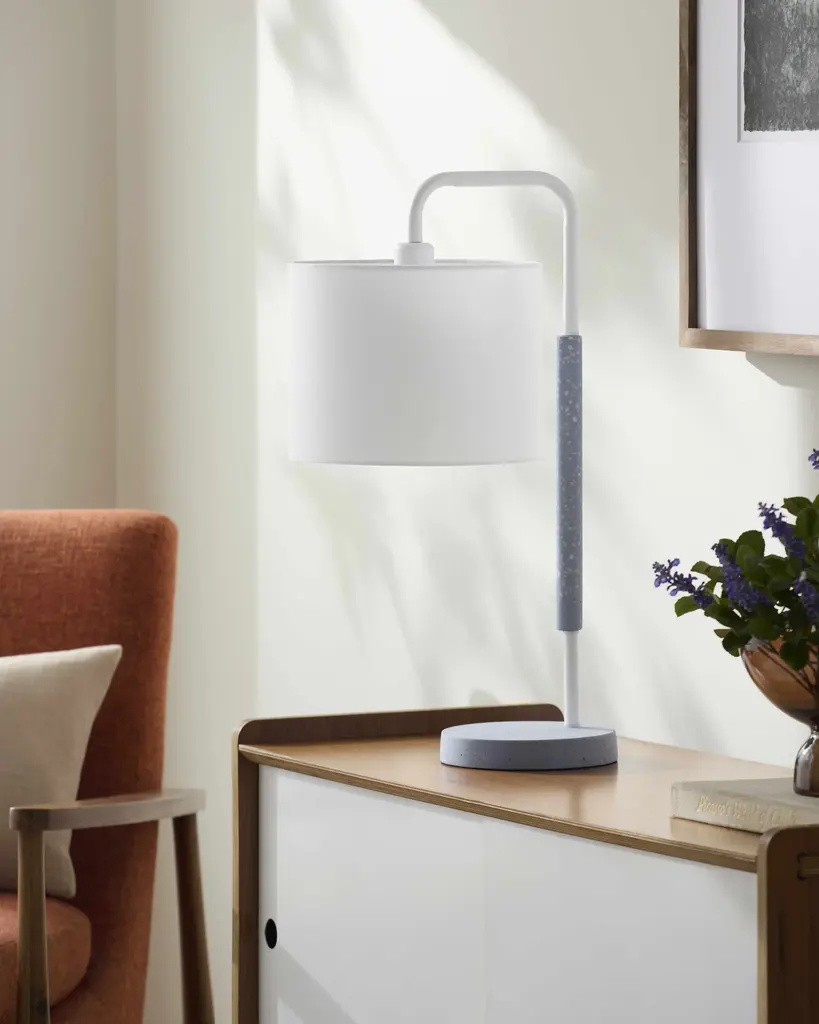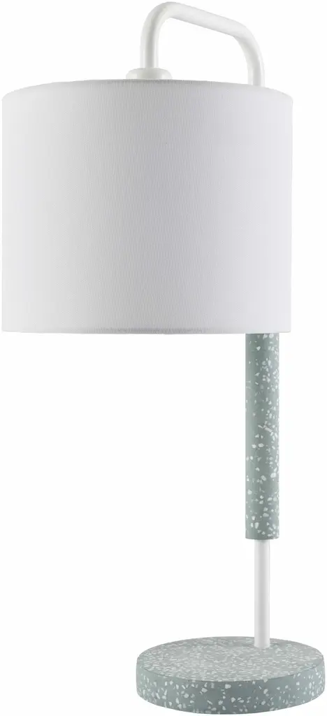 Collection: Ellerstadt Colors: Blue, White, Translucent Material: Body: Cement,Base: Cement,Shade (Outside): Linen,Shade (Inside): Polyester Made In: China Lighting Type: Accent Table Lighting Base: Cement Base Color: Blue Shade Material: Linen, Polyester Shade Color: White, White Cord Length: 6' Switch Type: On/Off Number of Bulbs: 1 Socket Type: E-26 Bulb Wattage: 60W