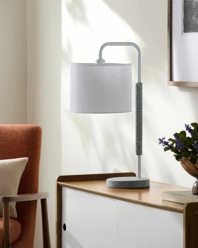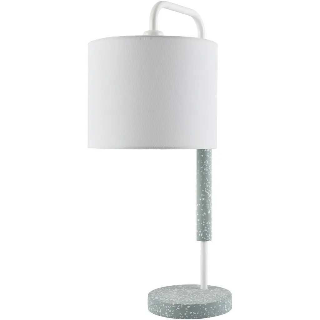 Collection: Ellerstadt Colors: Green, White, Translucent Material: Body: Cement,Base: Cement,Shade (Outside): Linen,Shade (Inside): Polyester Made In: China Lighting Type: Accent Table Lighting Base: Cement Base Color: Green Shade Material: Linen, Polyester Shade Color: White, White Cord Length: 6' Switch Type: On/Off Number of Bulbs: 1 Socket Type: E-26 Bulb Wattage: 60W