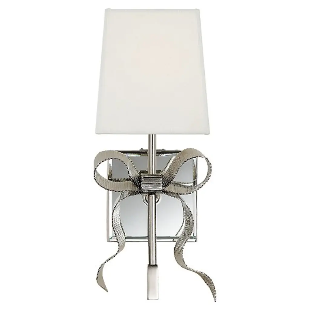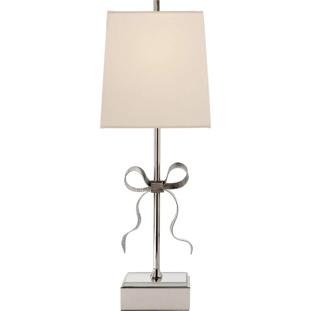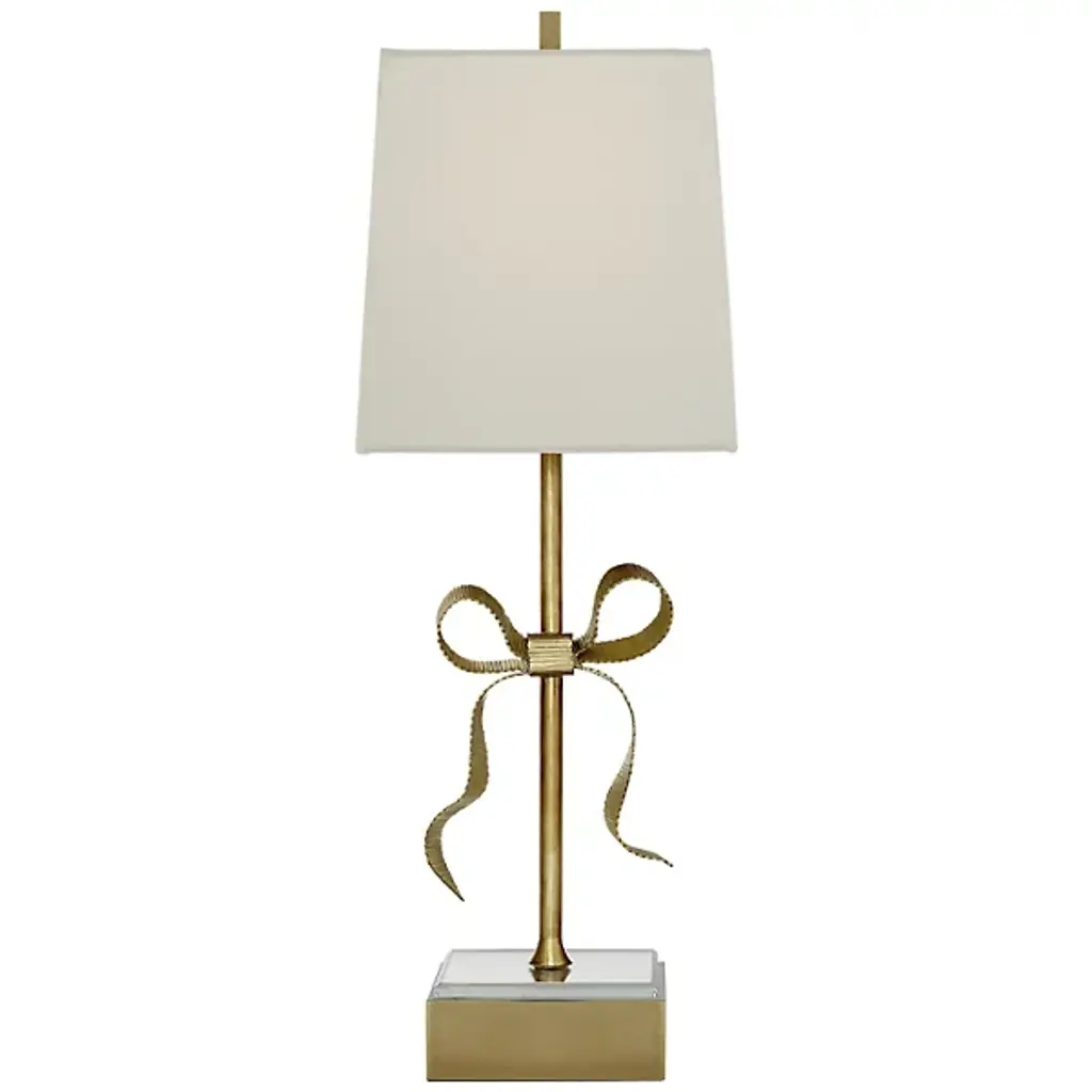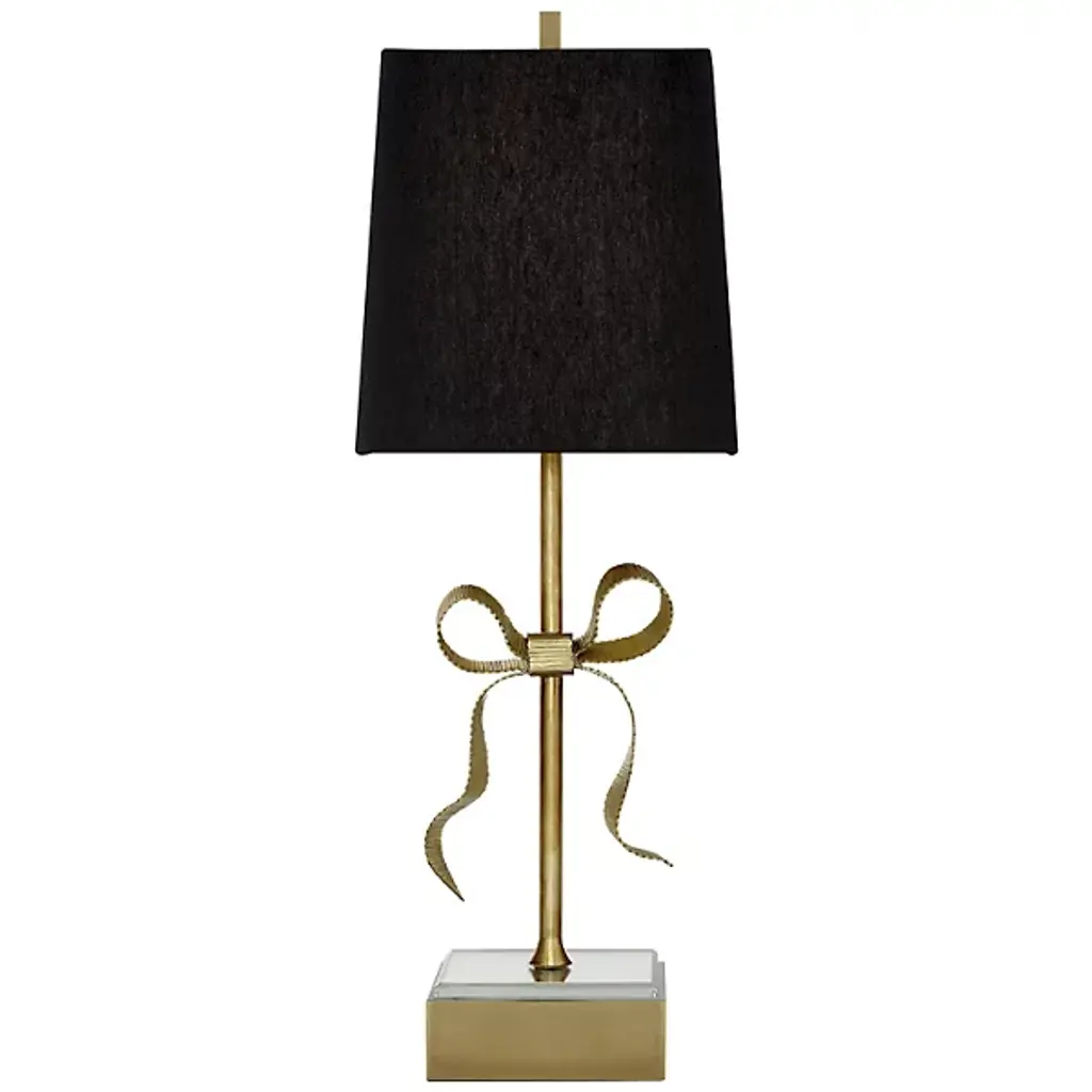 A beautifully crafted brass bow dresses the otherwise simple form of this table lamp with charm and elegance. A mirrored glass element on the base of the lamp helps reflect and spread light.