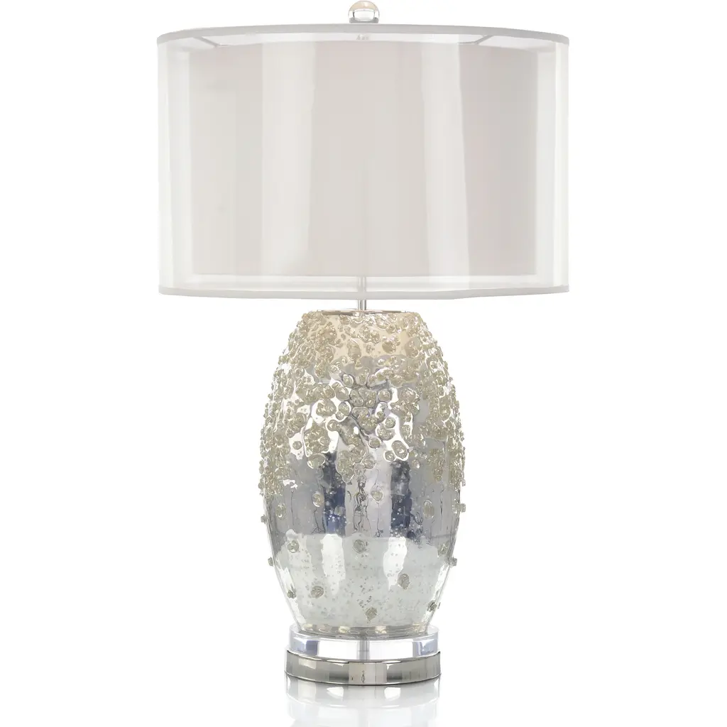 The Elodie Table Lamp is a gorgeous piece with a serene look, infusing an interior space with the tones of a cloudy sky. Crafted from glazed porcelain, the curvaceous piece features aged white tones overlying soft blues. This stunning design statement sits atop a round crystal base matched by an acrylic ball finial. The piece features steel neck hardware in a Nickel finish.