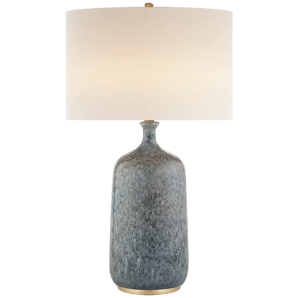 The Elodie Table Lamp is a gorgeous piece with a serene look, infusing an interior space with the tones of a cloudy sky. Crafted from glazed porcelain, the curvaceous piece features aged white tones overlying soft blues. This stunning design statement sits atop a round crystal base matched by an acrylic ball finial. The piece features steel neck hardware in a Nickel finish.