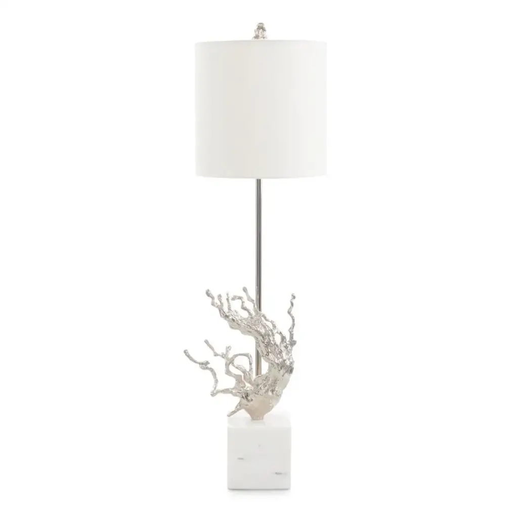 The Emanation Table Lamp showcases an ethereal look, contributing an air of mystique to an interior space. Crafted from brass in a nickel finish, the piece takes on a metallic sheen that is juxtaposed against a wispy organic shape resembling a puff of smoke. The lamp gently rests atop a pristine squared base of white marble, and features nickel hardware and an organic finial to match the body, completing the look of this three-way turnkey lamp.