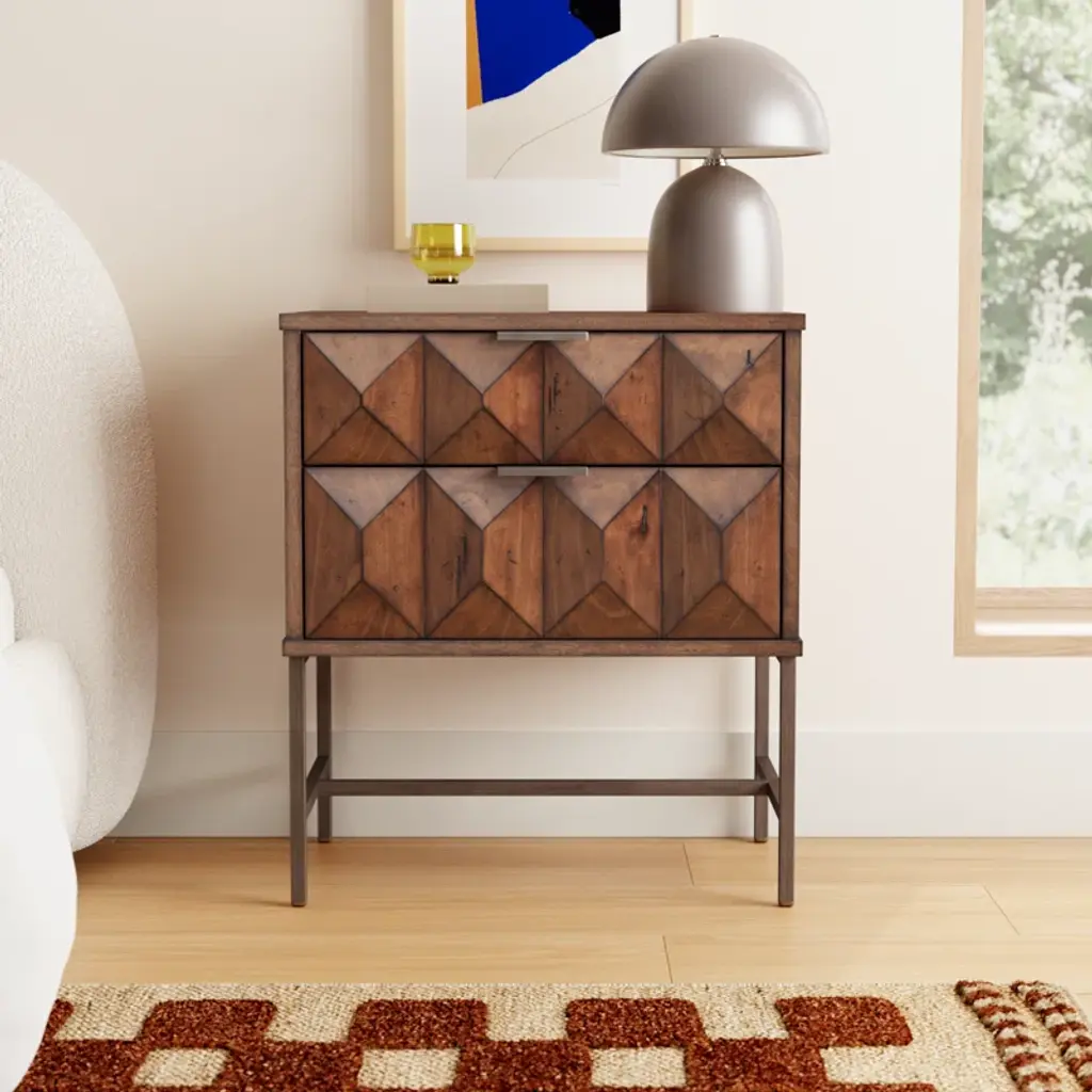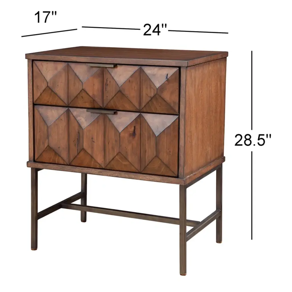 Lend your bedroom a splash of mid-century modern style with this charming 2-drawer nightstand. Crafted from a mix of solid and engineered wood in an antique brown finish, this nightstand strikes a clean-lined rectangular silhouette on a bronze medal trellis base. Two drawers offer out-of-sight storage for bedside essentials like books, reading glasses, and remotes, while faceted geometric accents along the front provide a touch of texture. Plus, the surface top is a great spot for a small lamp or framed photo.