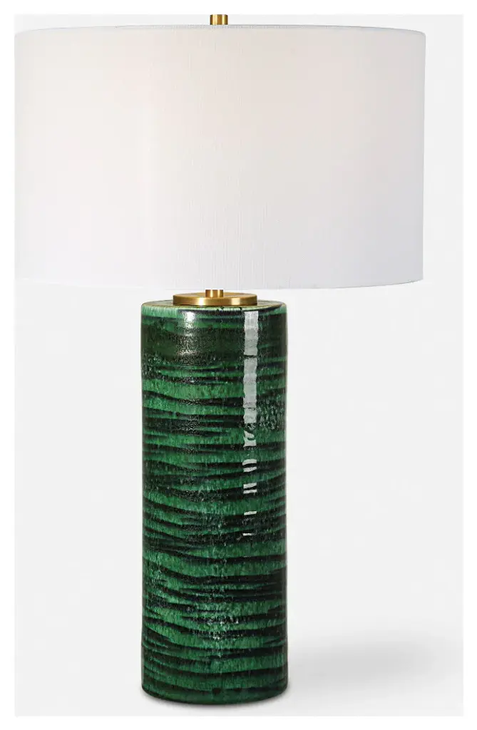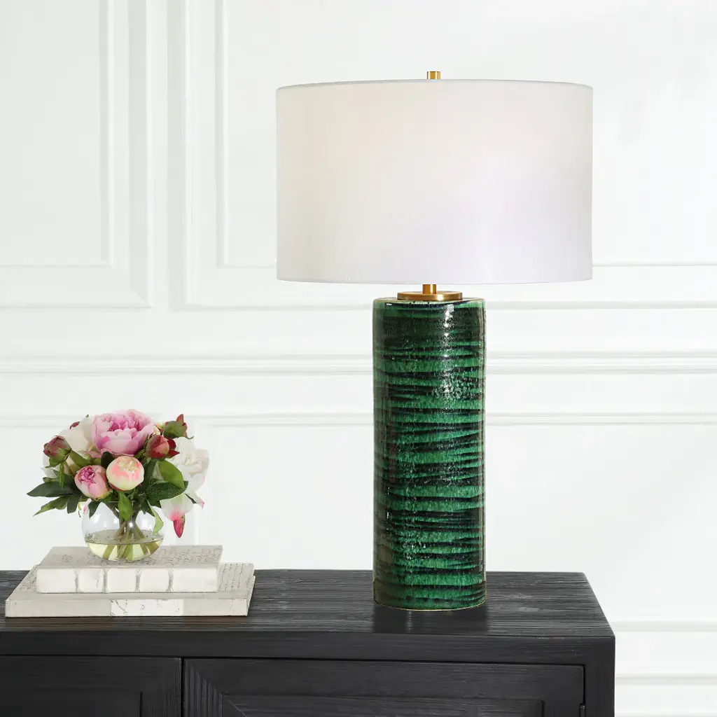 Emerald Green Swirl Stripe Cylinder Table Lamp 28 In Gloss Ceramic Elegant