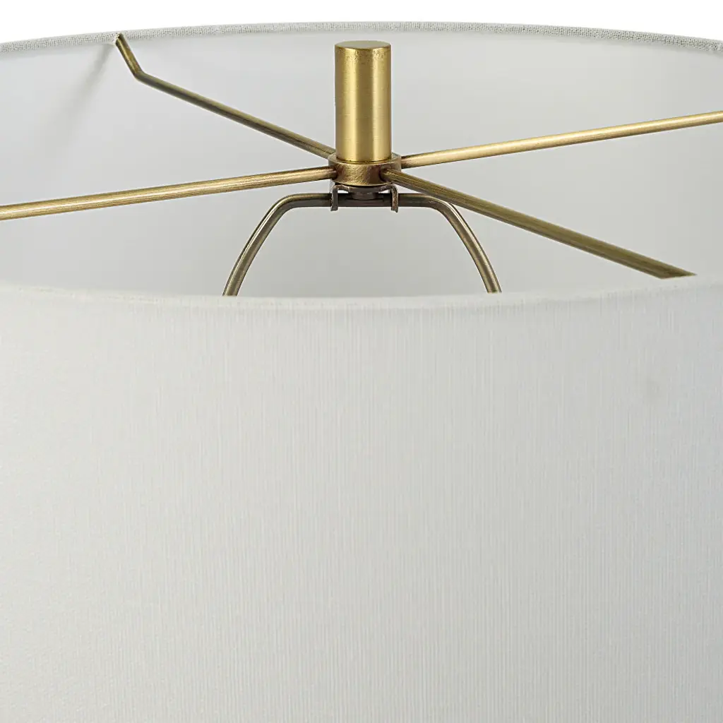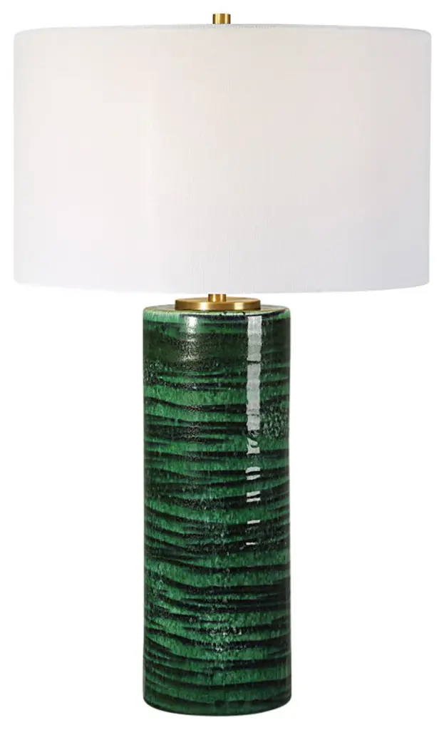 This table lamp features a ceramic base finished in a two-toned dark and light emerald green glaze with an abstract stripe pattern, accented with antique brass plated details. Round drum shade has a casual white linen fabric with natural slubbing. Due to the nature of fired glazes on ceramic lamps, finishes will vary slightly.17"W x 17"D x 28"H. Weighs 13 lbs.Hand Finished Ceramic. Linen Fabric ShadeUL listed. Uses one max 150W Type A bulb (not included). 3 way socket switch.Heirloom Quality - Expertly hand crafted and hand finished. Due to the hand crafted nature of this piece, each piece may have subtle differences.