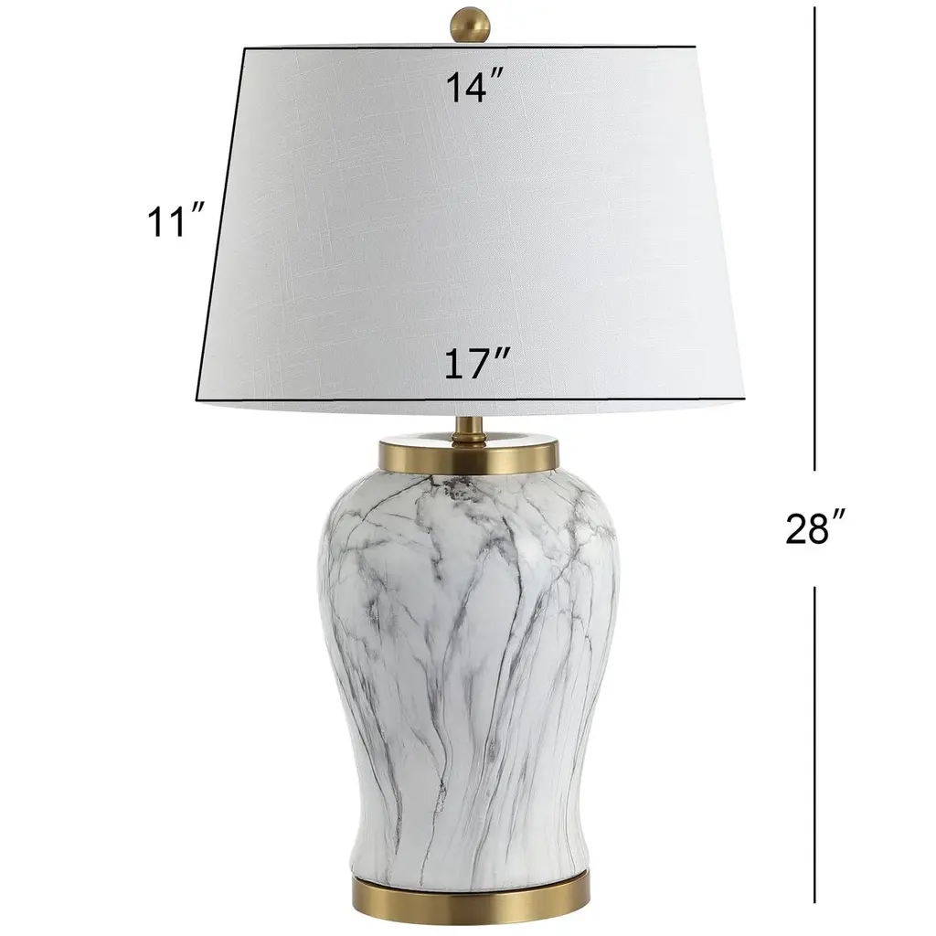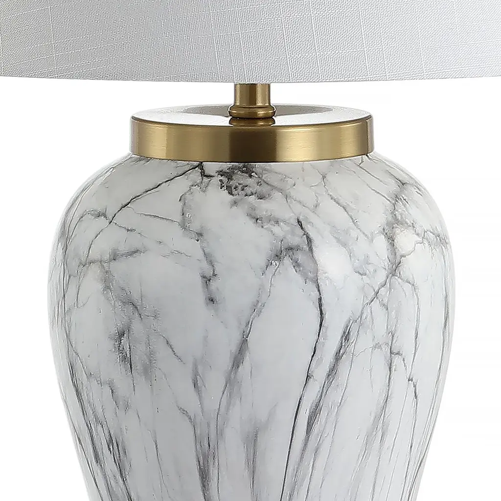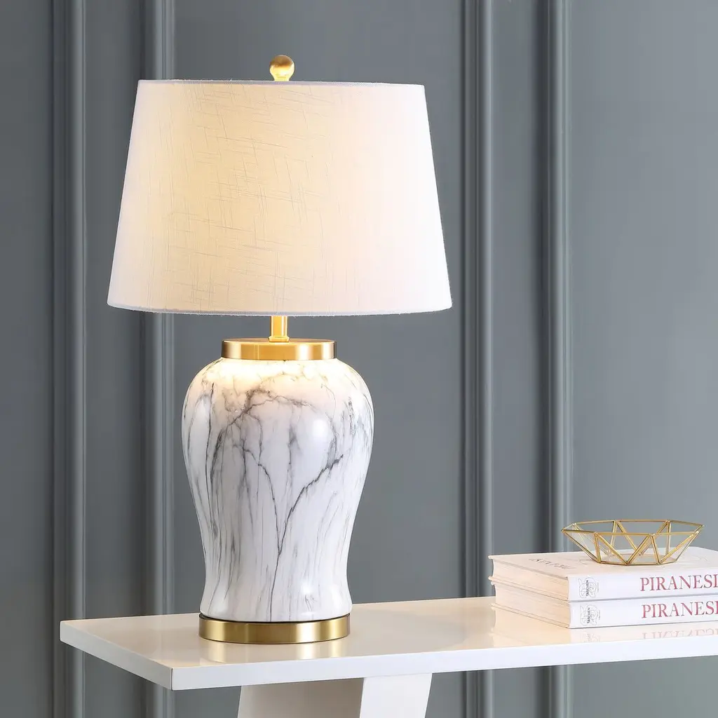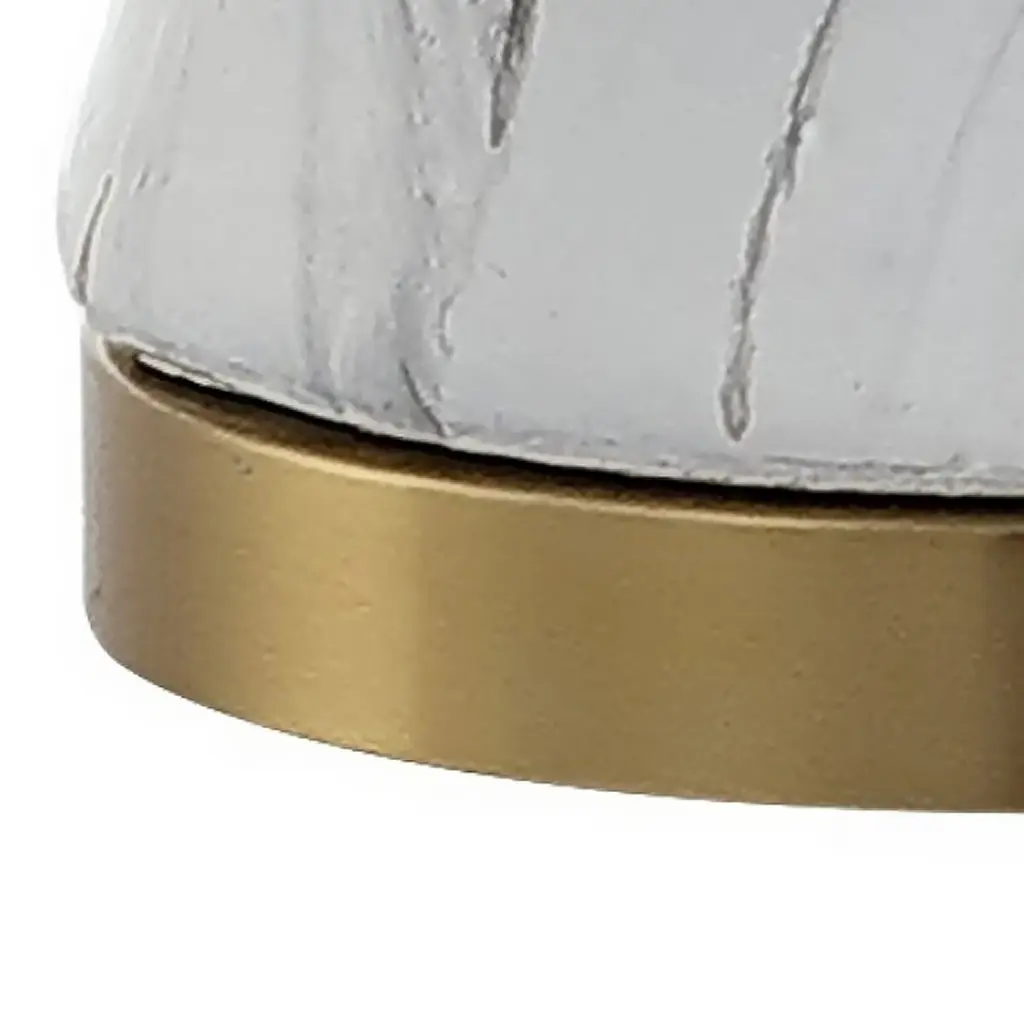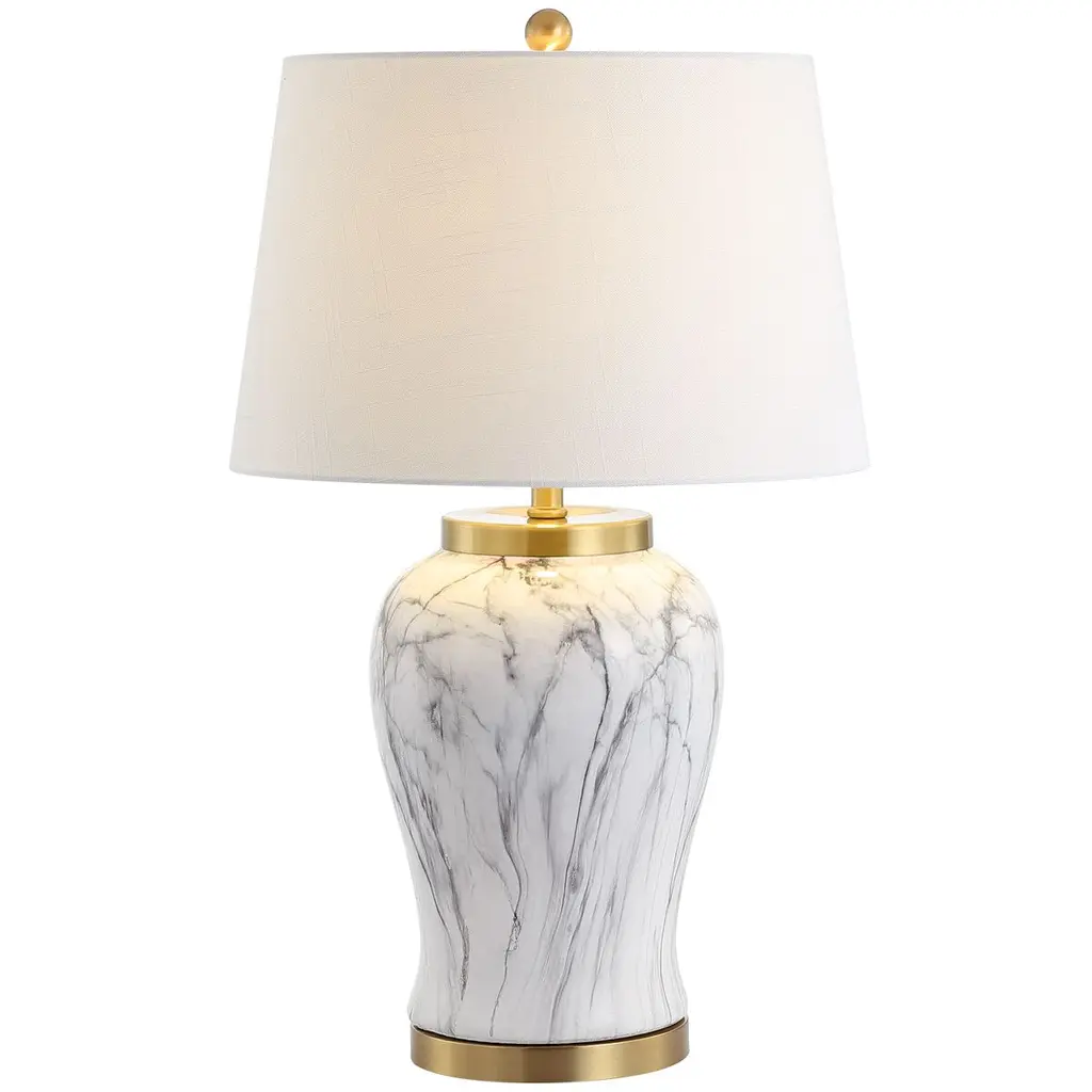 This table lamp's vase-shape body is made of ceramic but looks like marble, thanks to its hand-painted finish. Golden accents, a white linen shade, and a silk-wrapped cord heighten the elegance.