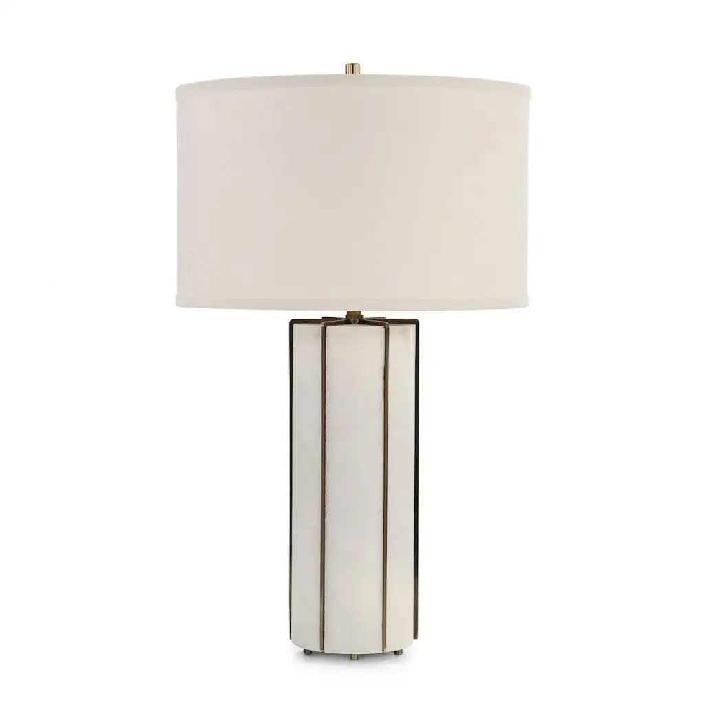 The Eminence Table Lamp is a tasteful statement piece that leverages natural materials to create a contemporary look. This marble lamp with a rounded shape showcases a gorgeous white tone, trimmed with slender metal rods in Antique Brass that run vertically from the neck to the base. The piece stands atop subtle Antique Brass legs, matched by the hardware and cylinder finial. The look is completed by a white linen drum shade with rolled edges.