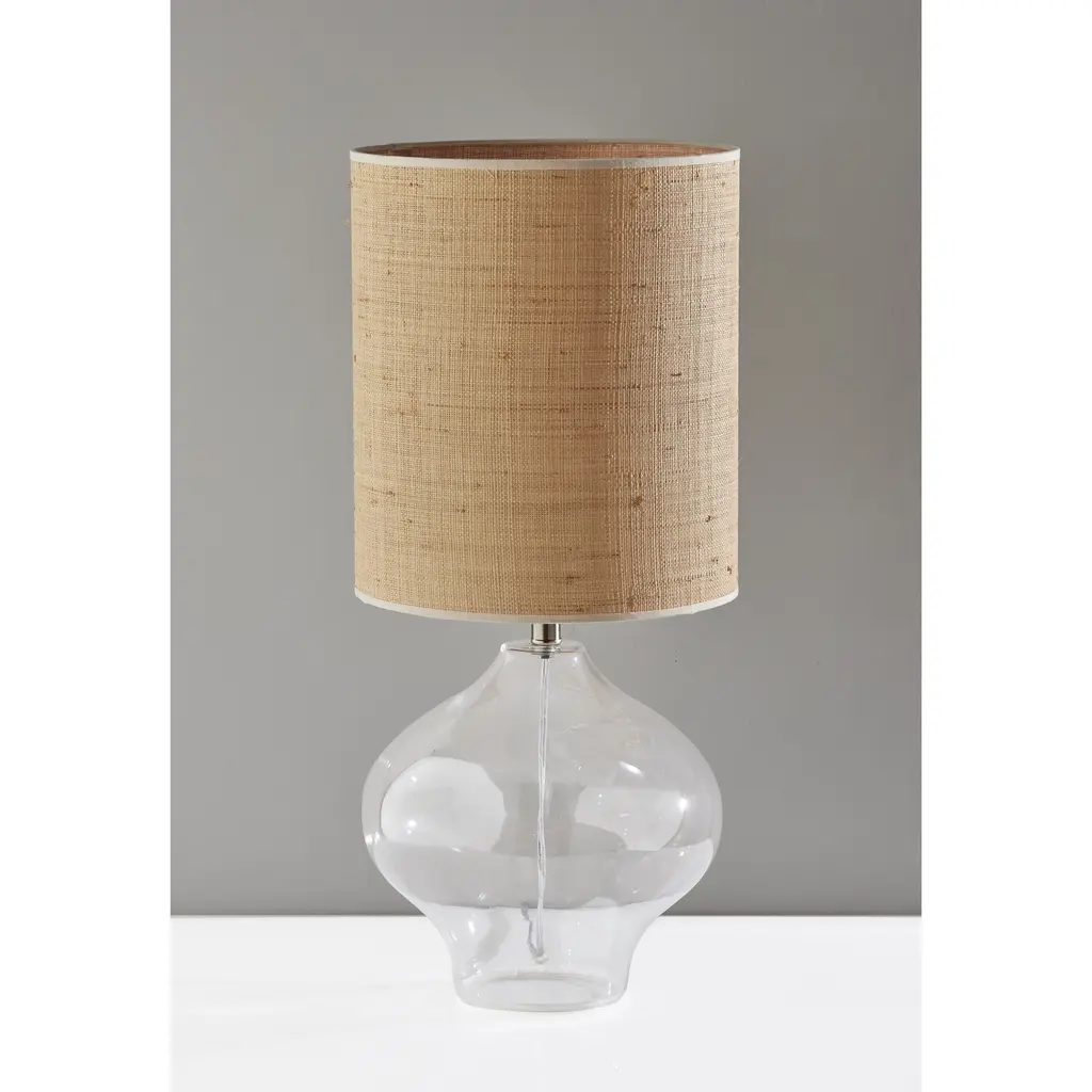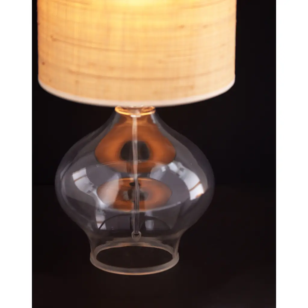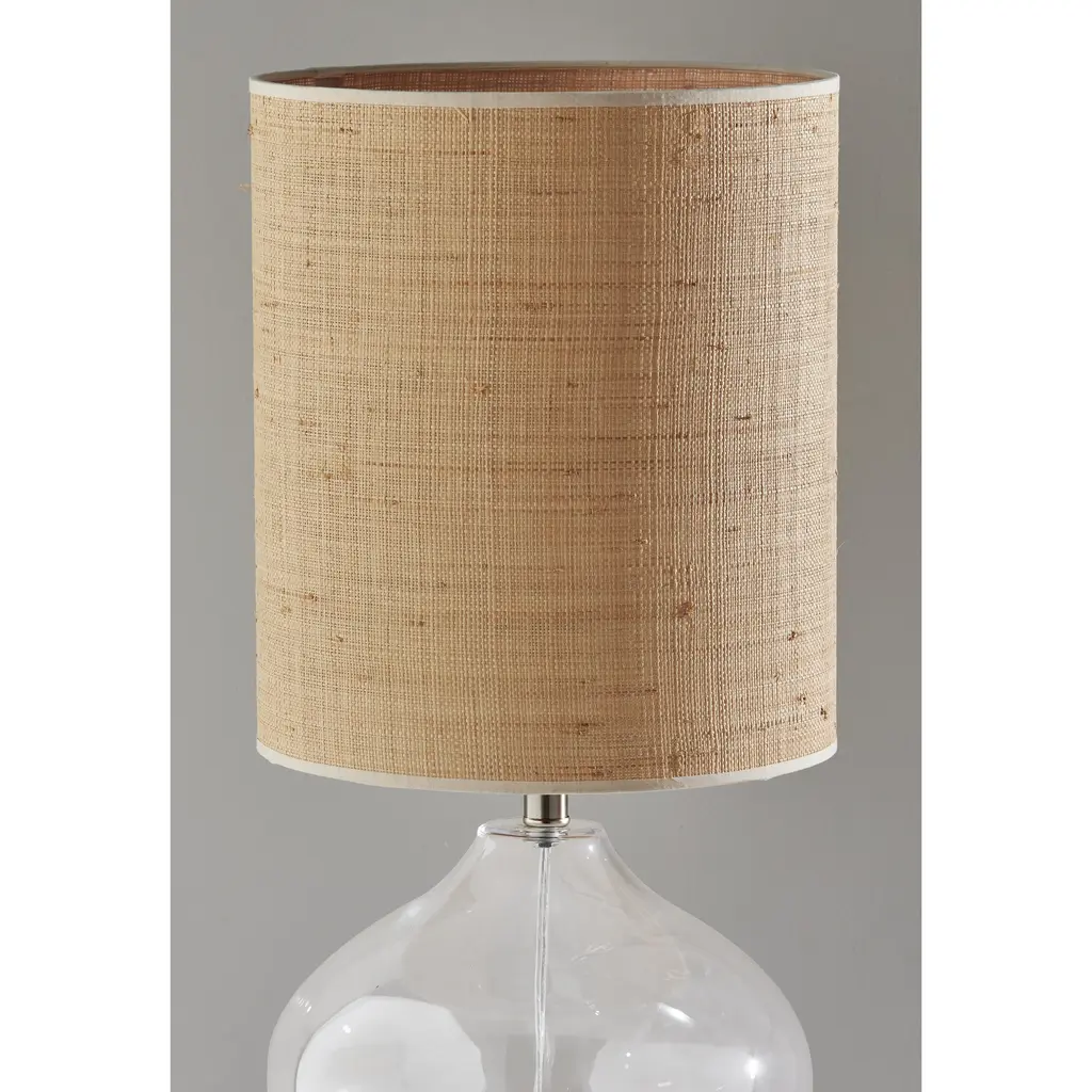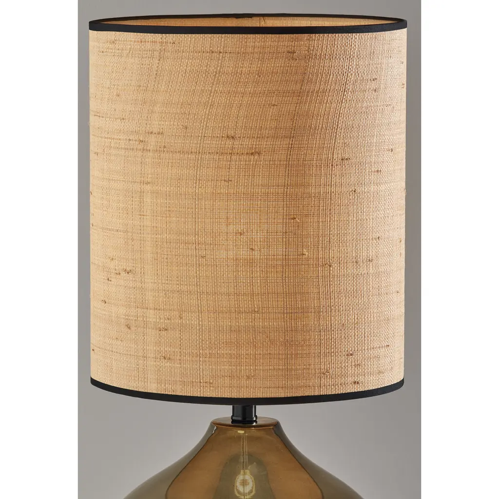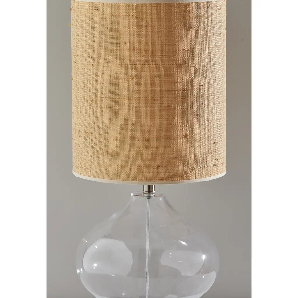 Introduce a relaxed, easy vibe to your home with the coastal design of the 28.5-inch tall Emma table lamp. Featuring natural elements with its dark green glass base and a natural woven rattan shade, this lamp imbues any space with warmth and light. The tall rattan drum shade softly disperses light and is trimmed in black fabric along the top and bottom, complementing the black neck. A 5' clear cord runs down through the center of the round glass base for a truly unique look. Easily operated by a rotary socket switch, the Emma table lamp powers a 100W bulb. This lamp is also available with a clear base and steel neck, and both color options are offered in a smaller, 23.5-inch tall size for the perfect lighting solution to any space.Features: Natural materials and color scheme complement coastal design.Finish is Dark Green Glass & black neck or Clear Glass & steel neck. The clear lamp cord visibly runs down the center of the glass base for a distinctive look.Complete your decor by mixing and matching between the different color and size options. Lamp Measures 28.5-inchH. x 13-inchW. x 13-inchD. Shade measures 13-inch Dia. X 15-inchH Natural Woven Rattan w. Beige Trim ShadeShade Fitter is Screw Down UnoRequires 1 x 100W E26 Bulb (Not included)