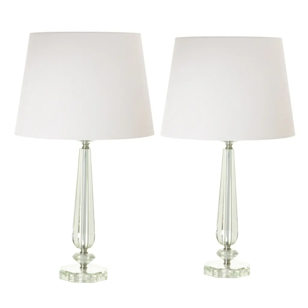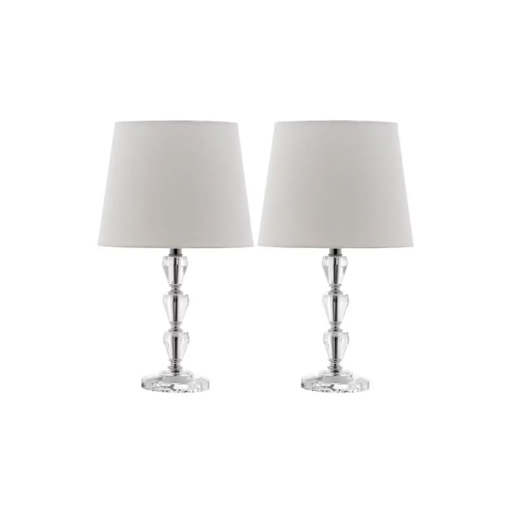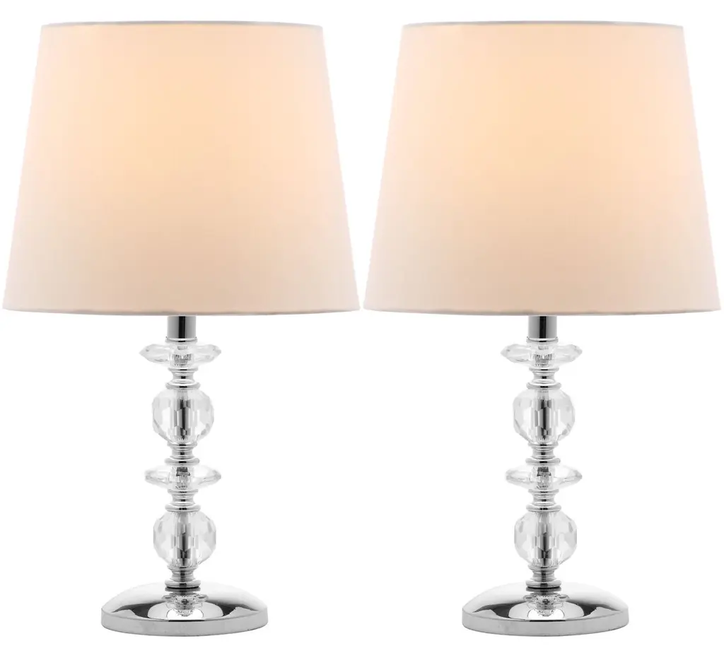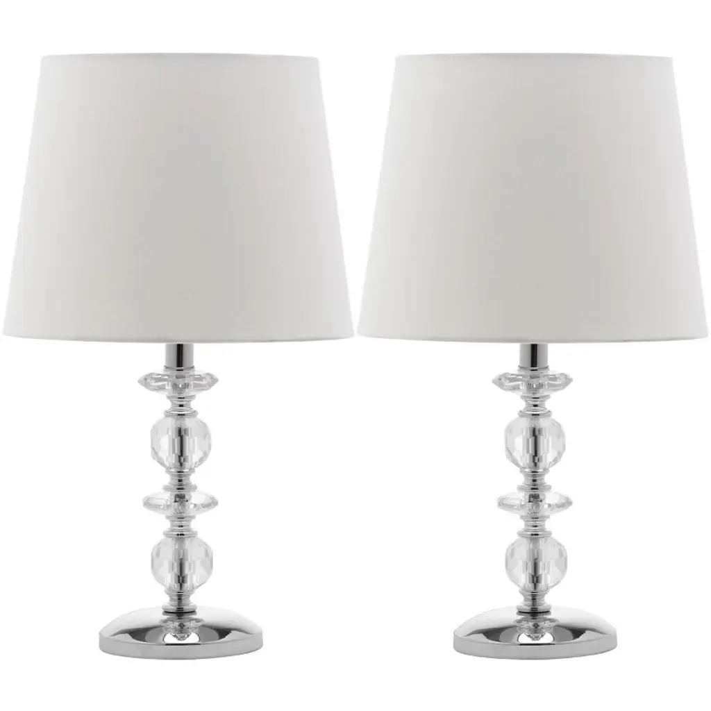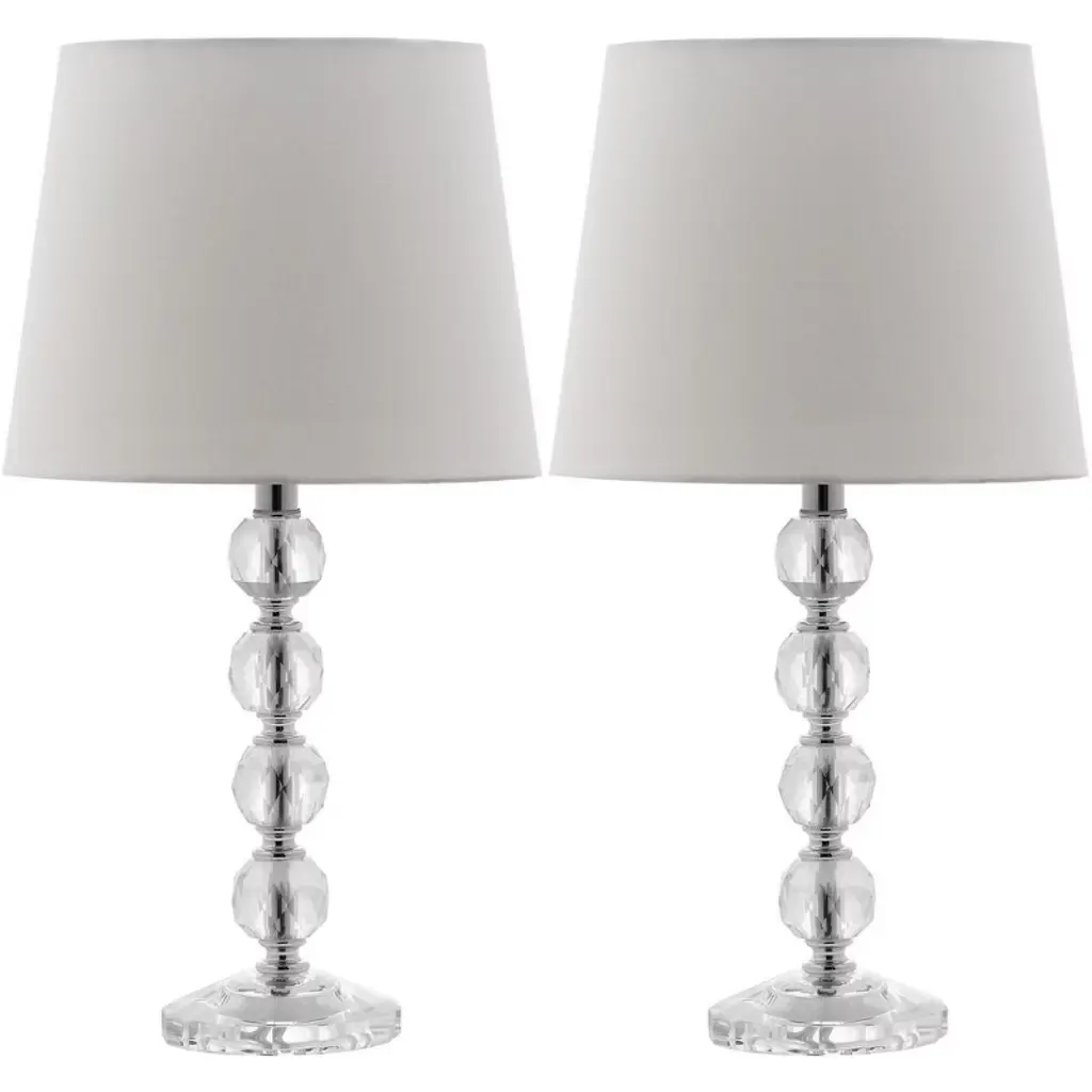Stacked crystal balls add a fun, modern touch to this set of table lamps, each adorned with a white Geneva shade.