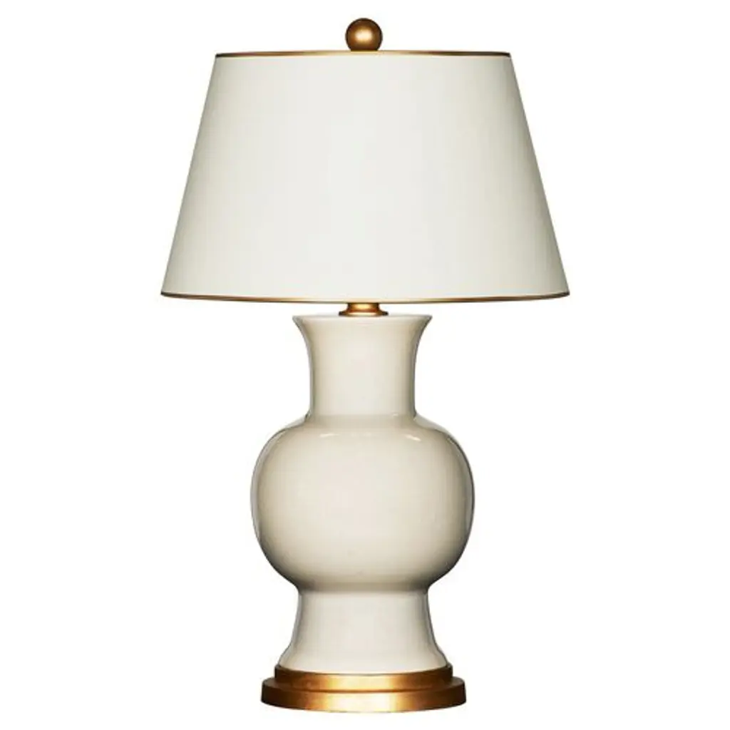 Glazed in soft cream pewter with gold leaf accents, this French-inspired ceramic fishtail lamp adds undeniable style to the scene. A hardback empire shade in cream-hued French parchment and gold trim complete this stunning design. Made in the USA.