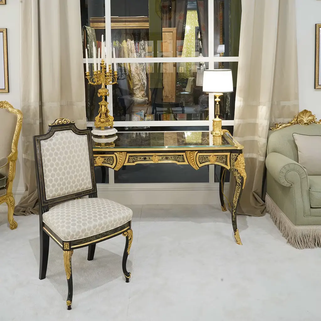 An absolute gem of timeless sophistication, this refined table lamp features a sleek Empire-style design. Meticulously handmade with particular care for details, it is in 24K gold-plated bronze, enriched with handcrafted of black-lacquered wood decoration and completed with a pleated fabric shade. Please consult the Concierge for further information.