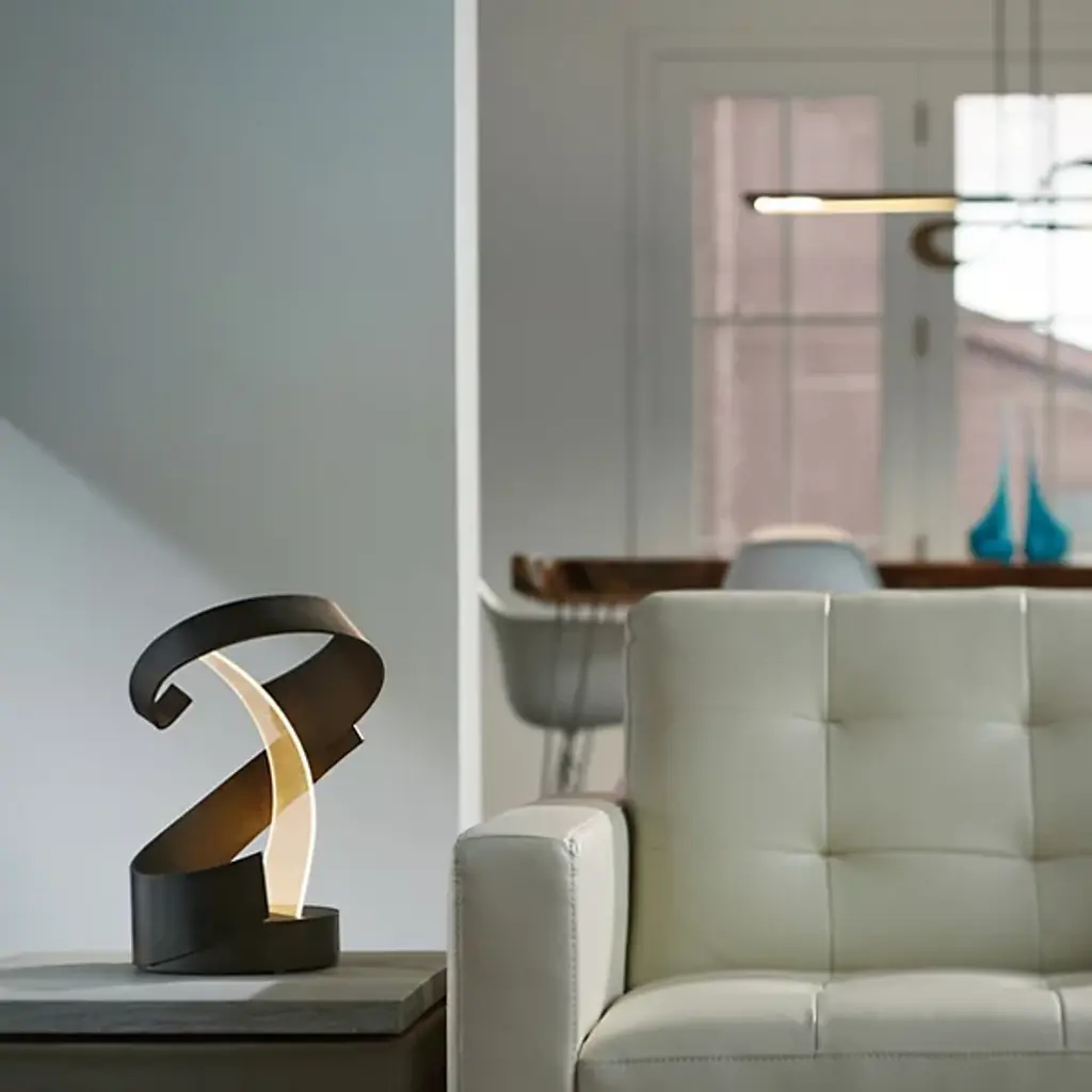 The Hubbardton Forge Encounter LED Table Lamp embodies dynamic curves, a juxtaposition of materials and energy efficiency through innovative technology all in one. The curved ribbons of steel wrap around the hand bent acrylic light guide, which has a functional as well as aesthetic purpose. Using technology previously only seen in the television and advertisement industry, the LED illumination is injected into the acrylic and evenly diffused through the embossed texture of the light guide.