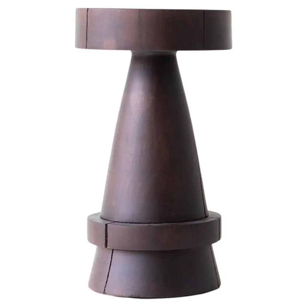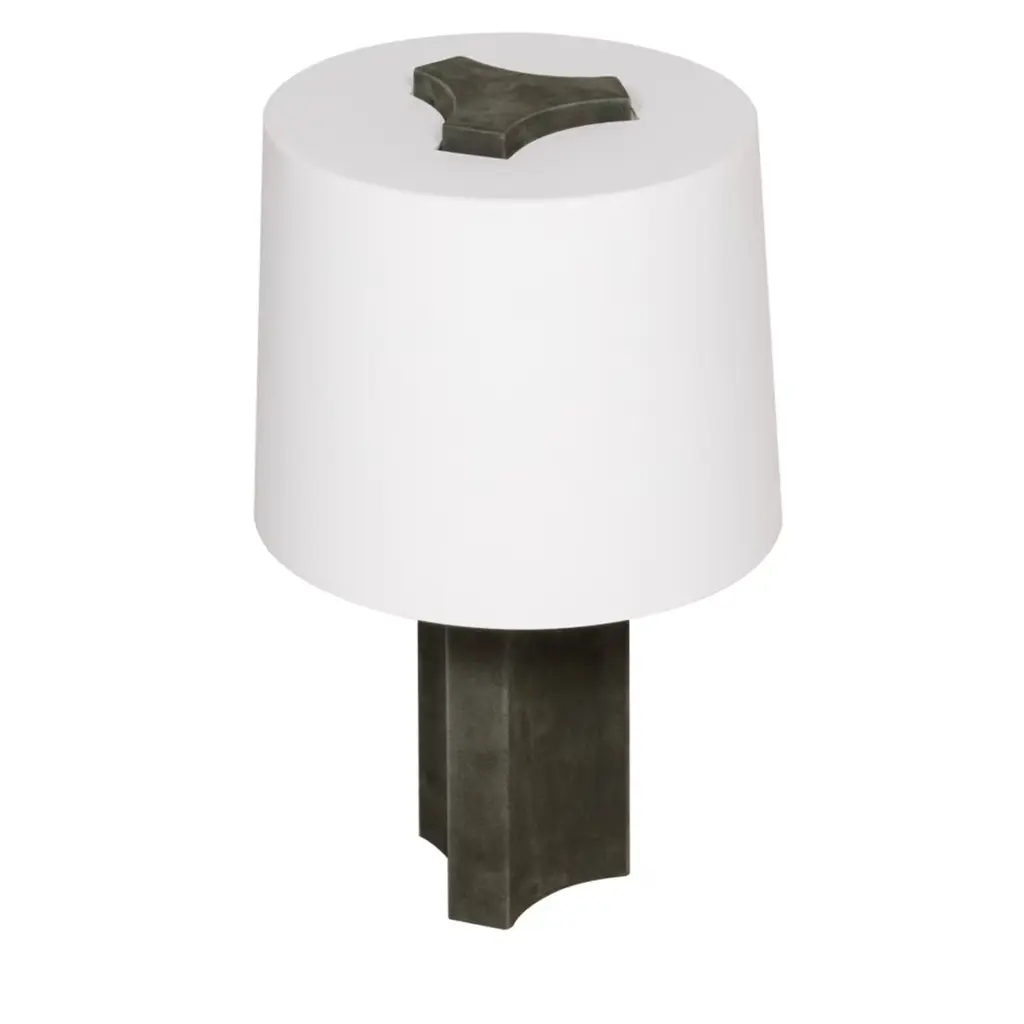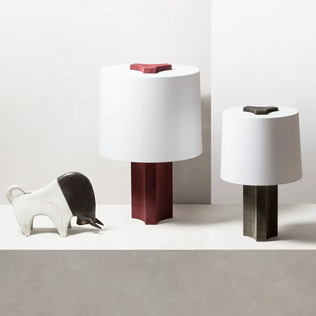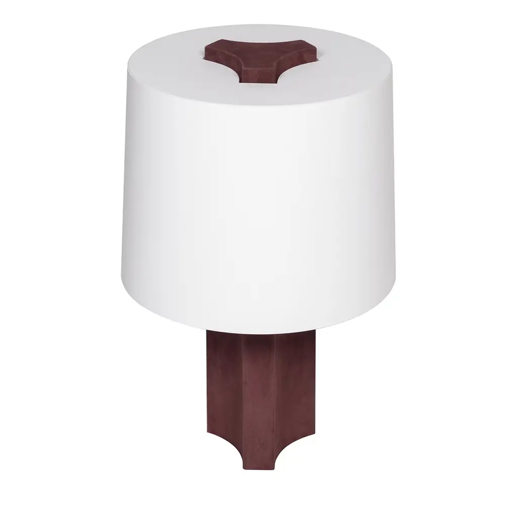 Leather-covered wood base with a fine linen lampshade. Being inspired by architectural elements typical of classical antiquity, such as the ancient Greek columns, this lamp boasts fine curves and edges that showcase eyecatching interplays of shadows when lit.