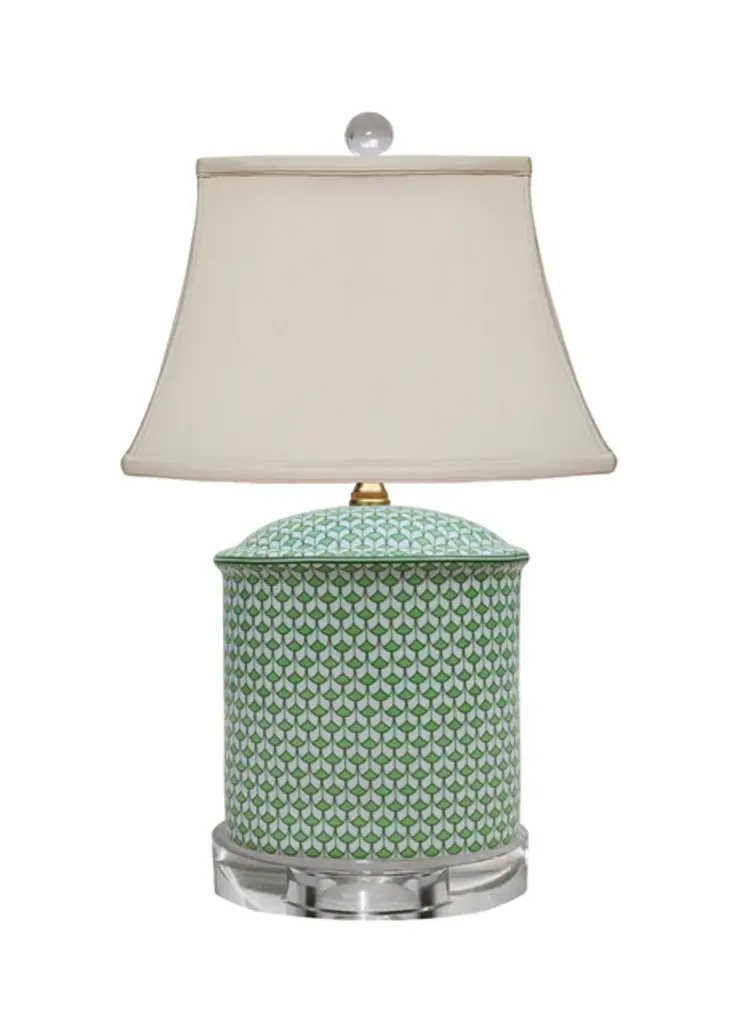 A cheerful and sophisticated green and white porcelain lamp with a matching finial and rectangular-oval, off-white shade. It's a classic lamp that is sure to light up any space! Comes with your choice of either a gold or crystal base. Details