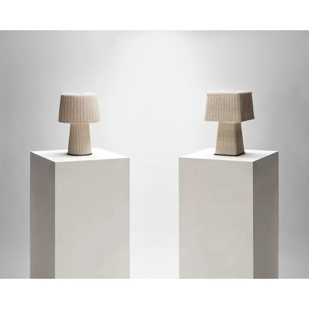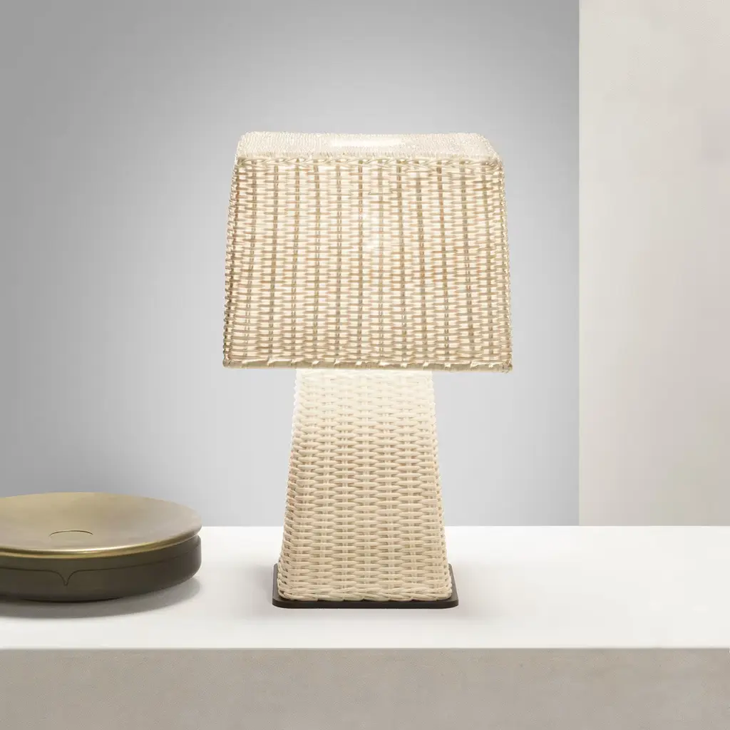 An exquisite showcase of craftsmanship, this table lamp is entirely upholstered in a meticulously hand-woven natural rattan cover that transforms this everyday object into an accent piece of exceptional sophistication. Showcasing a simple and traditional silhouette, it features a bronze structure that elegantly contrasts with the delicate and warm nuances of rattan.
