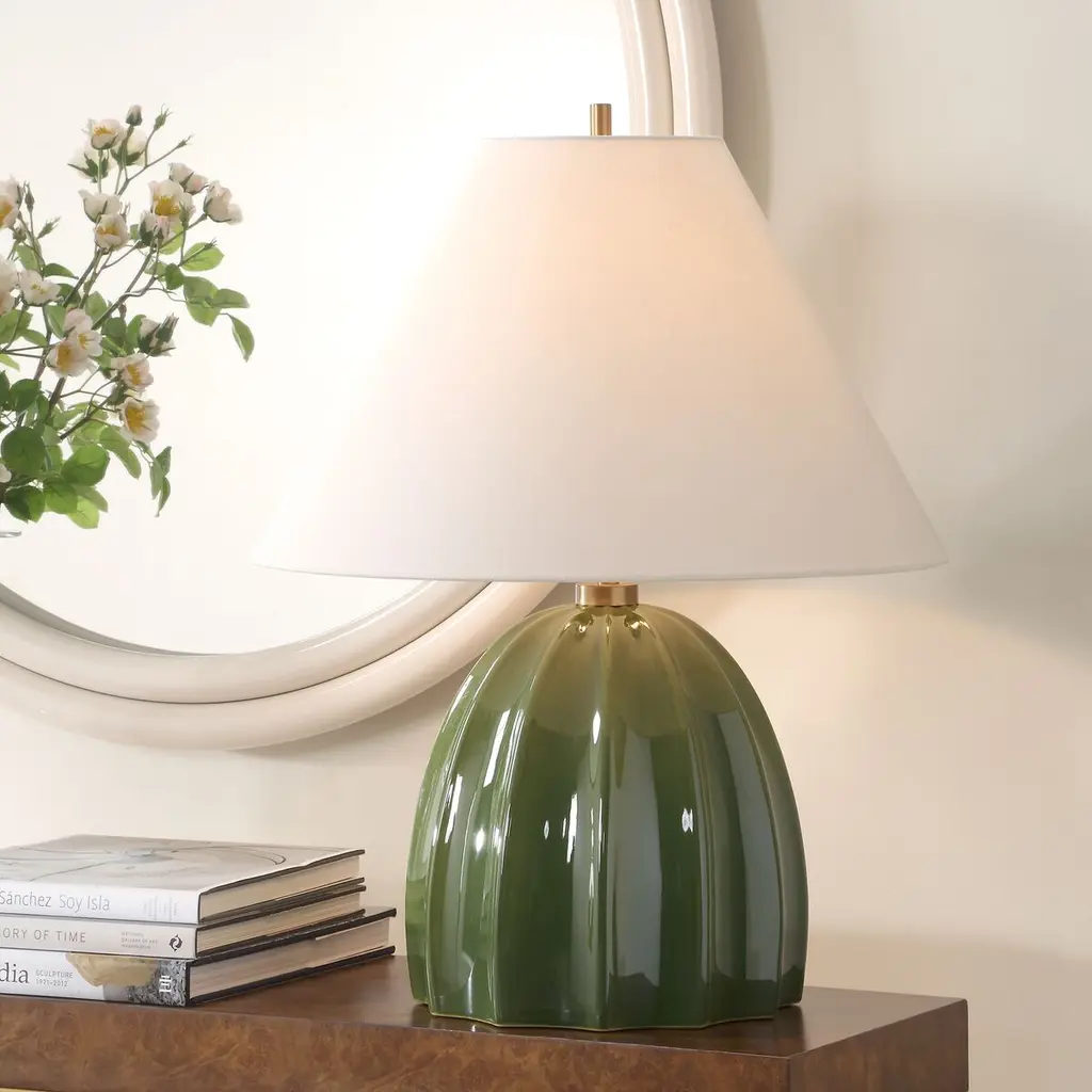 The Ephraim Table Lamp is a stunning piece that combines elegance and functionality. Its fluted ceramic base, adorned with deep channels and a gracefully tapered design, exudes a timeless charm. The lamp is beautifully accented with brass-plated details, adding a touch of sophistication. Topped with a coolie style round shade, covered in pristine white linen fabric, this lamp offers a soft, inviting glow to any space. Perfect for adding a refined touch to your decor, the Ephraim Table Lamp is a testament to exquisite craftsmanship and design.