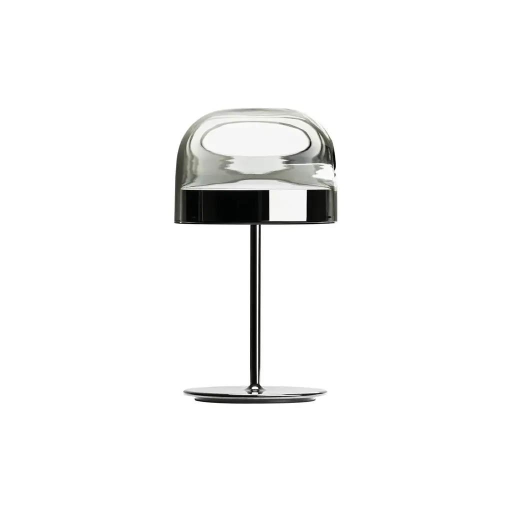 Equatore is a contemporary reinterpretation of the classic lamp with a glass shade. While the traditional abat-jour uses the shade to contain the light source within, in this family of lamps the shade is paradoxically and suggestively empty, with the light being generated by two luminous discs placed inside a central metal band, visible on the shade, that evokes the line of the equator. The light produced by the Leds, thanks to internal screens arranged in layers, is distributed regularly across the surface of the discs, magically illuminating them. The lower disk directs the light output downward, the upper one illuminates the glass cap for a soft, diffused light. Available in table, floor and ceiling models. Features