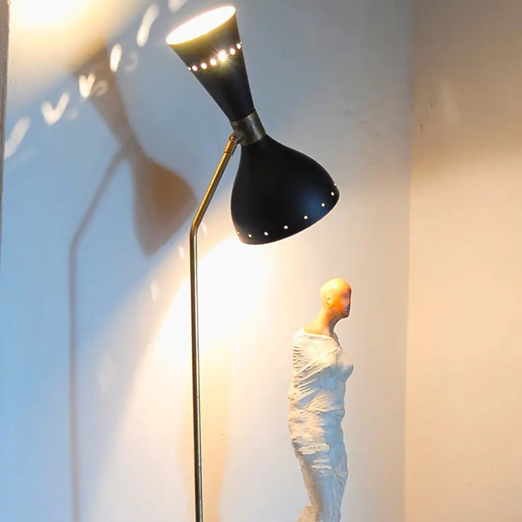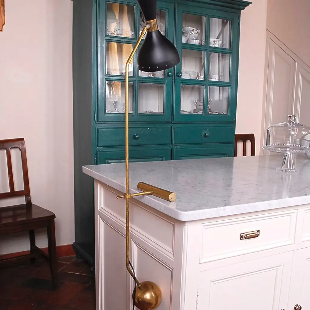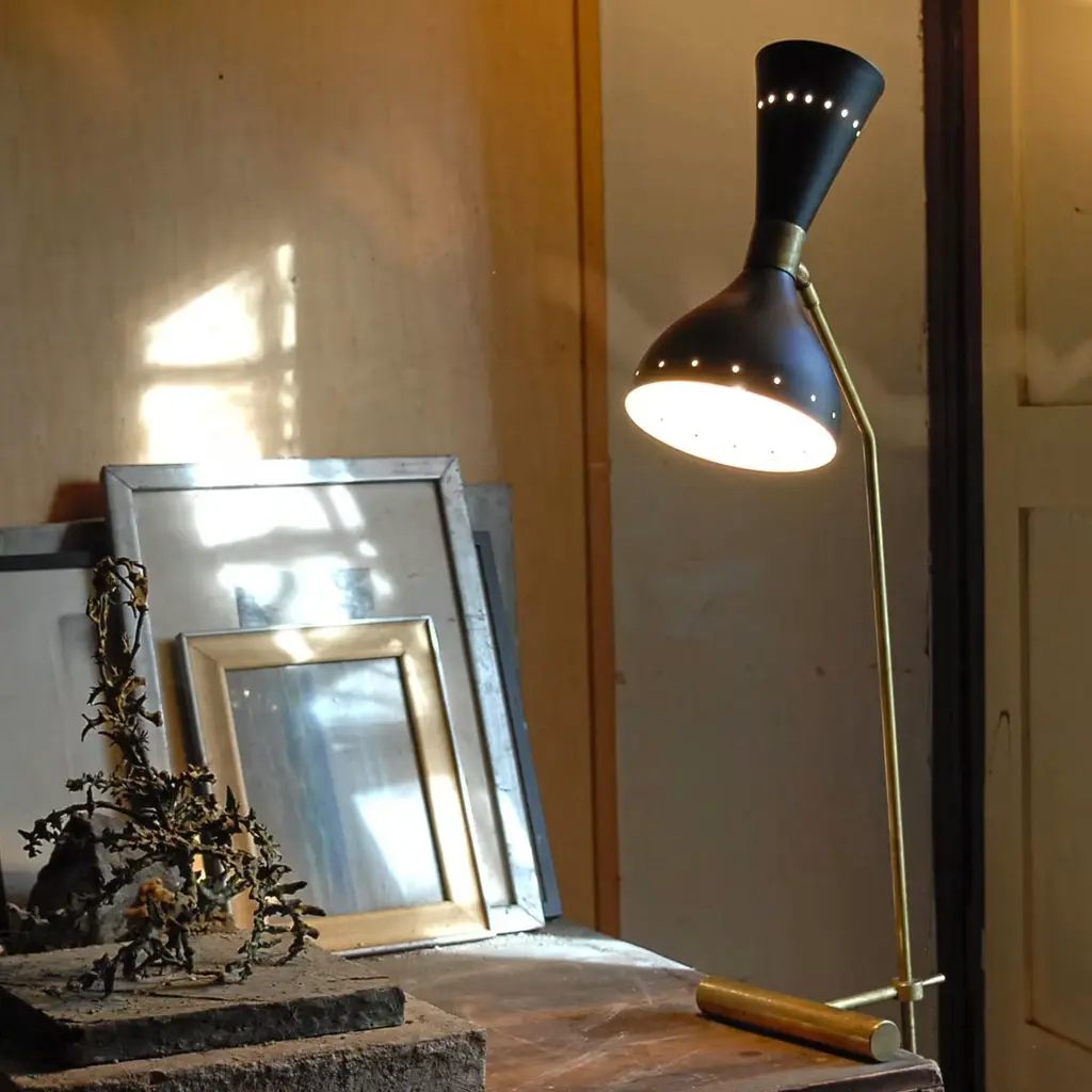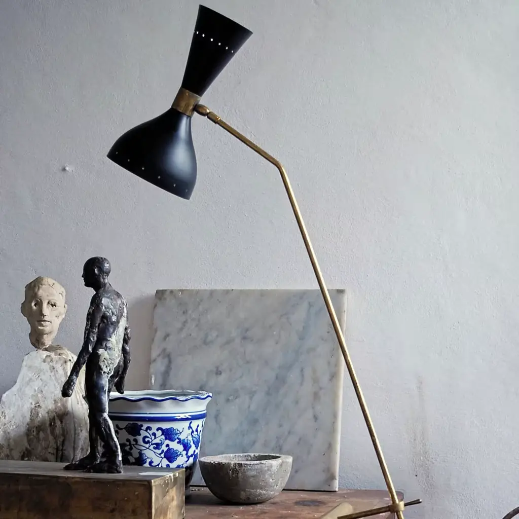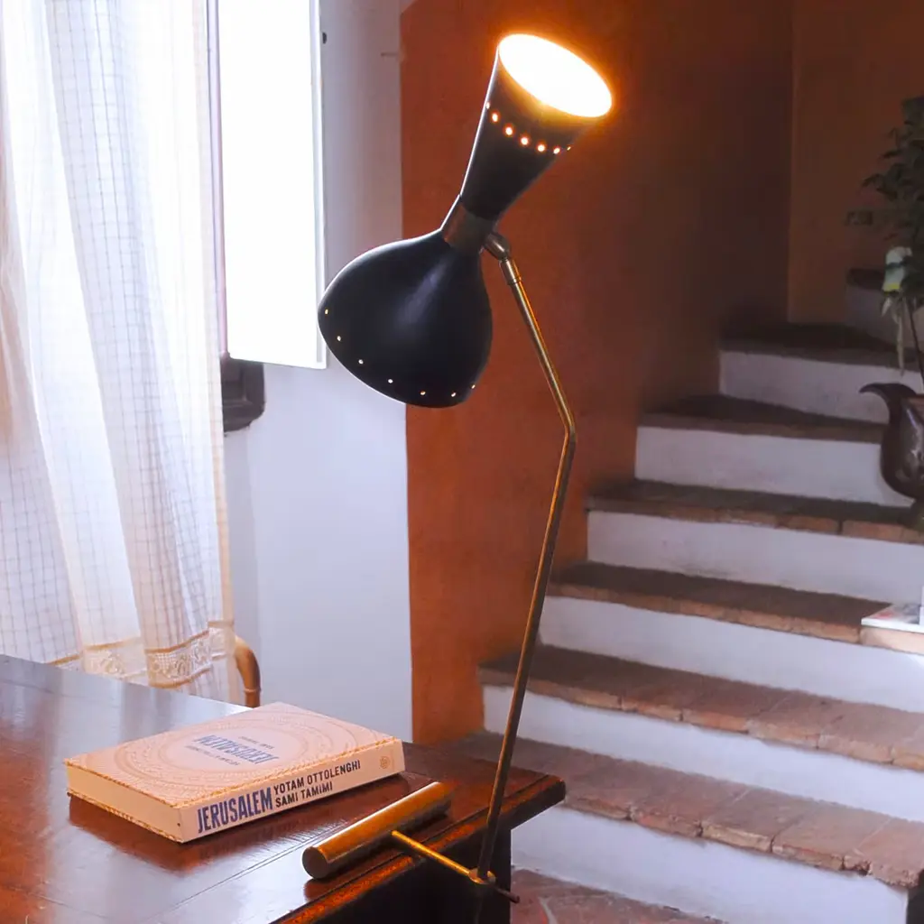 Poetically evoking the balancing act of a tightrope walker, hence its name in Italian, this table lamp boasts a sophisticated design that will not go unnoticed in a contemporary living room or modern study. A sphere is the counterbalance for the slender stem of this piece equipped with a double shade on the other side with twin bulbs, one to focus on a book, the other for ambiance. Entirely crated of solid brass hand-finished with wax, this lamp has a black shade (also available in ivory, red, yellow, blue, and sage green) and evokes the iconic charm of mid-century style.