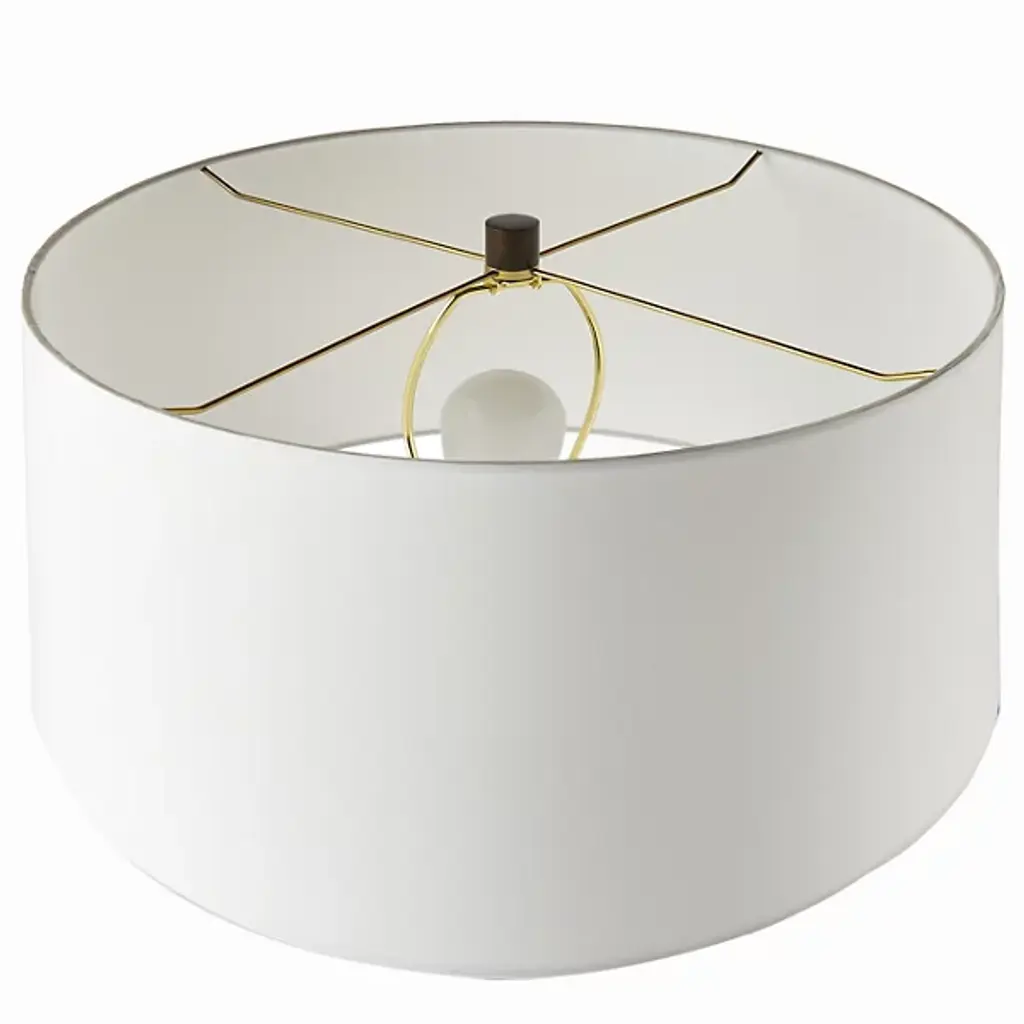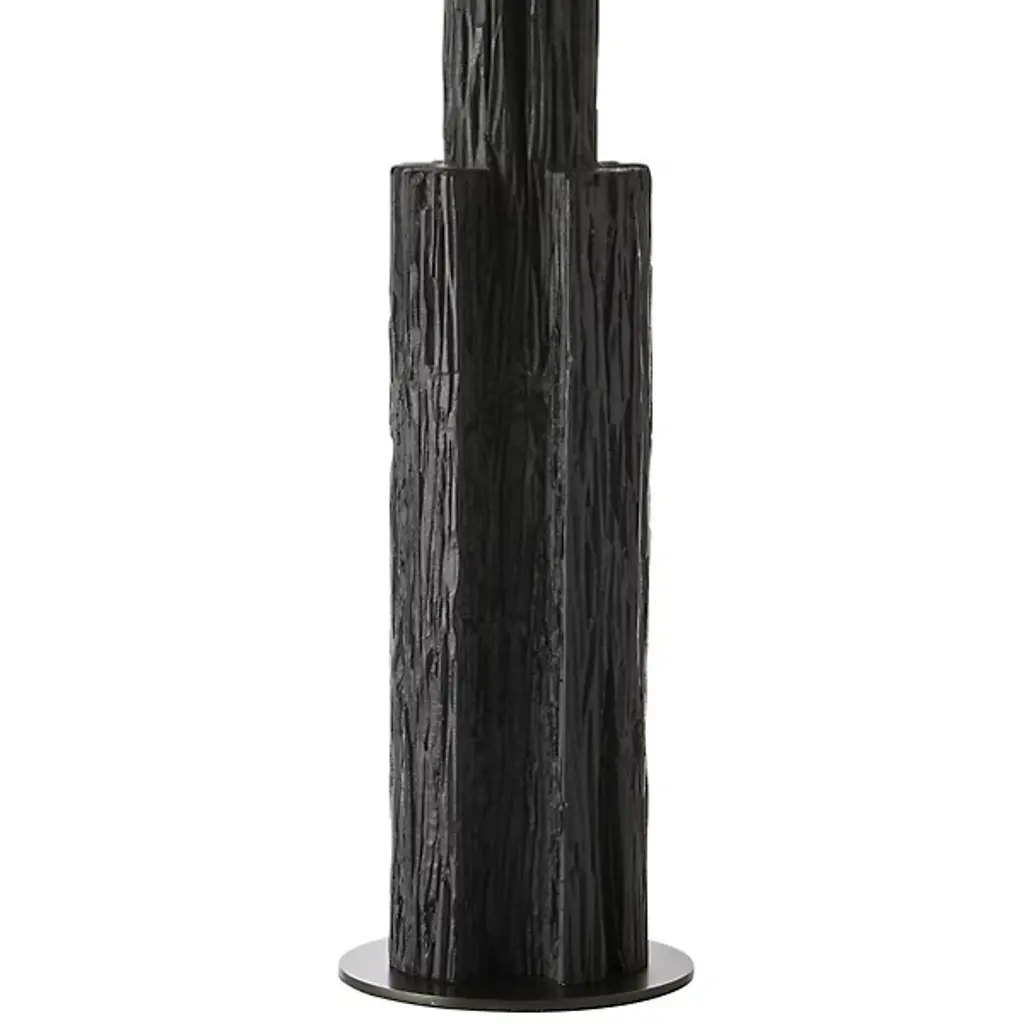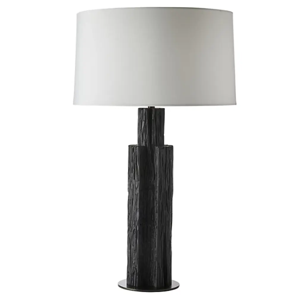 The Eris Table Lamp from Arteriors exudes a temple-like grandeur with its concentric cuffs of faux bois resin, finished in a deep ebony hue reminiscent of charred wood. This lamp radiates elegance and is mounted on a sturdy bronze steel base and crowned with a bronze cylinder finial. The bronze hardware complements the off-white microfiber drum shade, while a black cloth cord adds a refined touch. This piece seamlessly blends striking design with sophisticated finishes, making it a standout addition to any space.