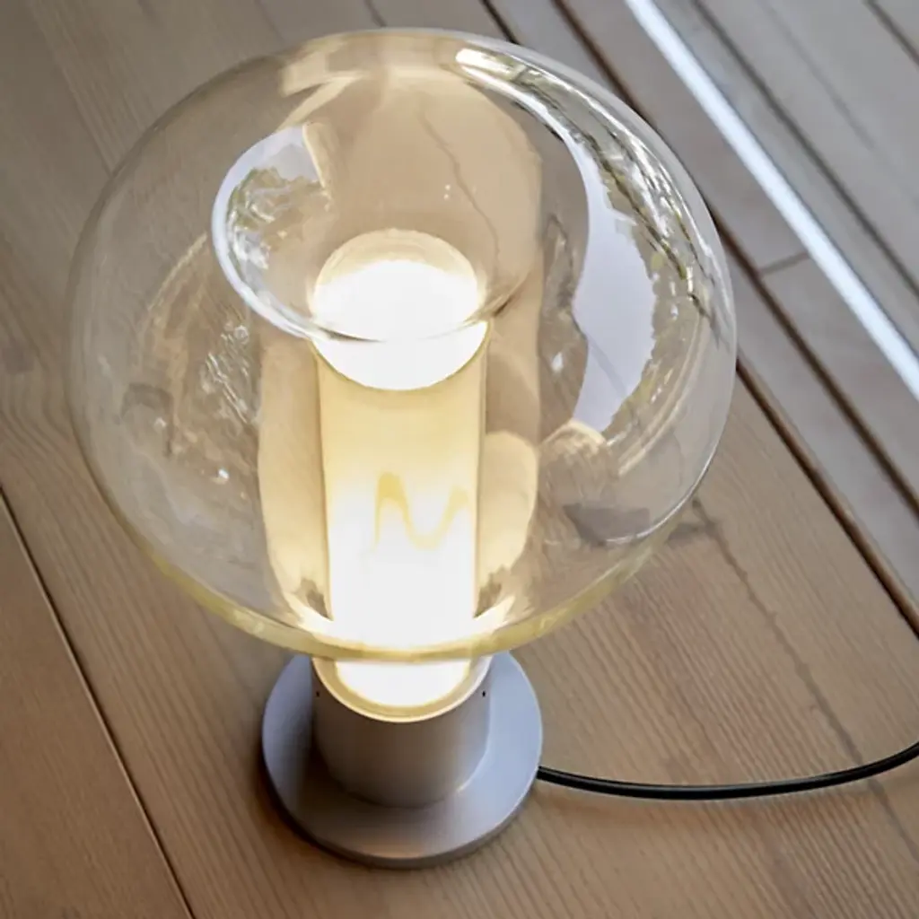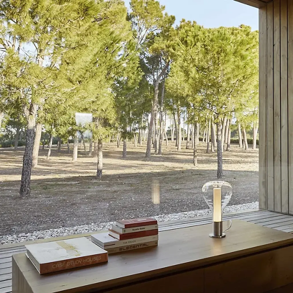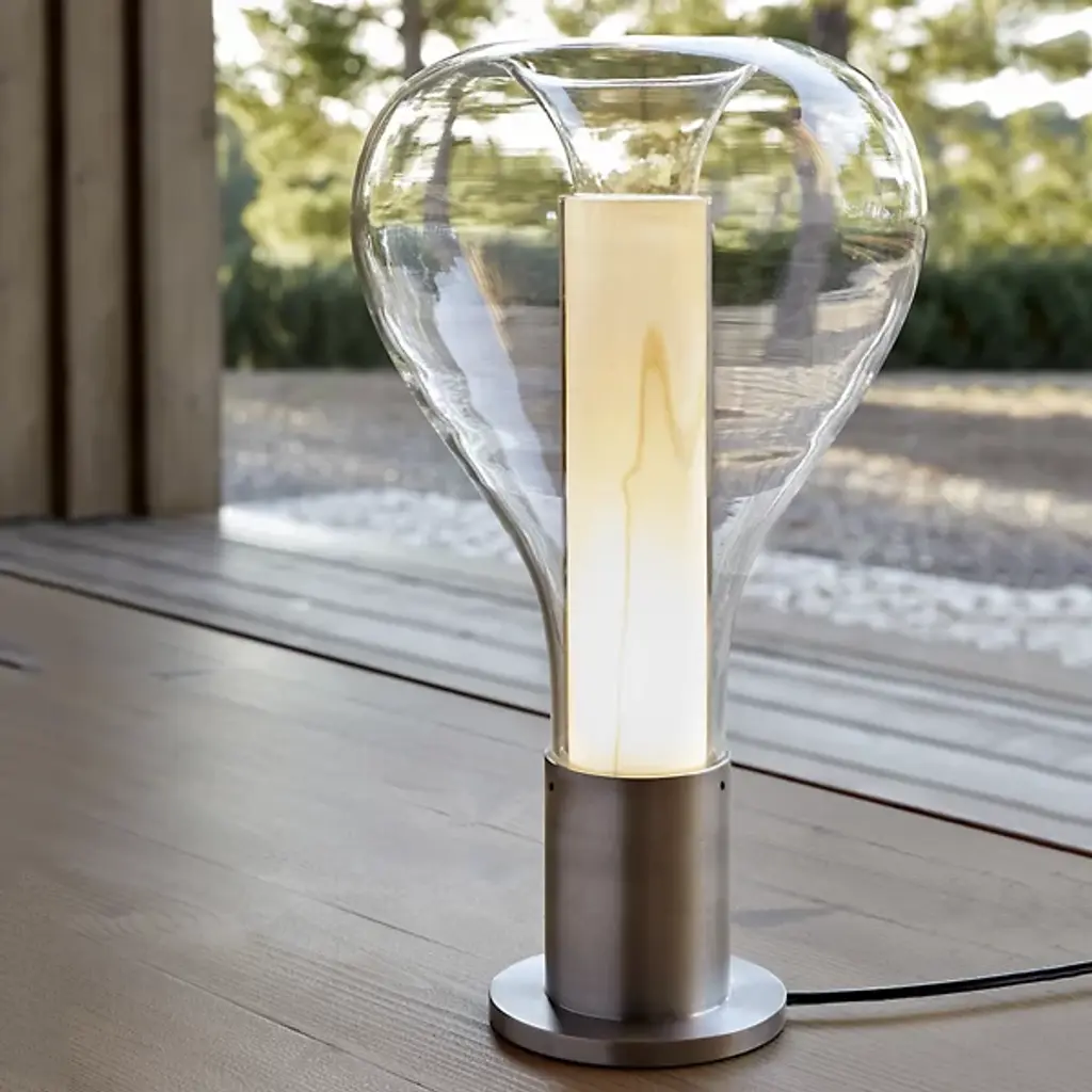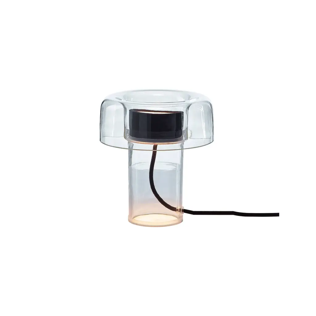 Bring a touch of ambiance to the surfaces of your home with the clean and welcoming silhouette of the Eris Table Lamp from LZF. Designed by Mayice studio in 2020, this modern piece uses mixed materials to maximum potential with a smooth, cylindrical metal base that sprouts an inner wood veneer shade. An outer bulbous, clear glass shade gently encloses upon the wood, framing it as an inviting demonstration of design possibility. An integrated LED resting inside the base sends out a warm glow that fills the wood, and the surrounding space, with life.