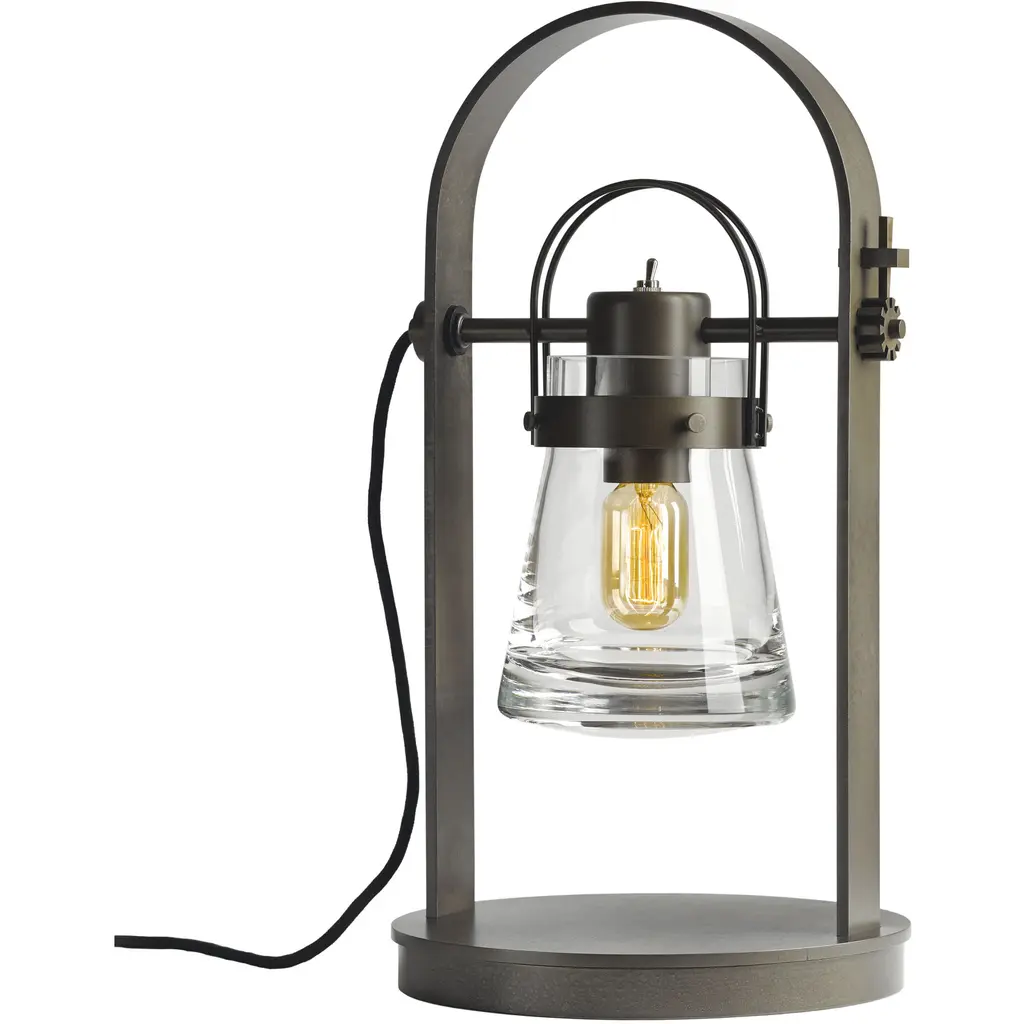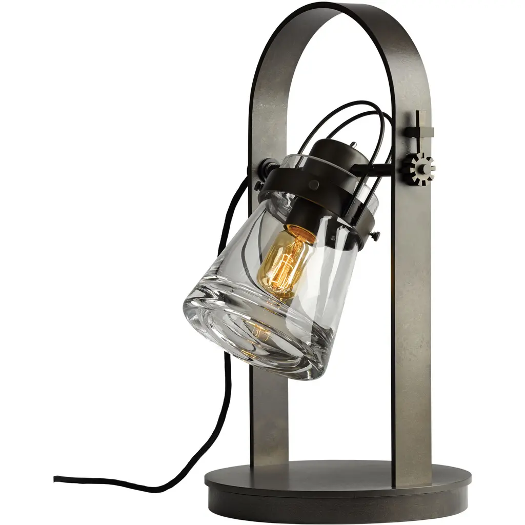 The clear, blown-glass flask of our Erlenmeyer Table Lamp is encircled by a handcrafted steel collar fixed to an arch within an arch. Angle can be adjusted with the steel cog locked by a steel pin - there's a touch of steampunk to the design.