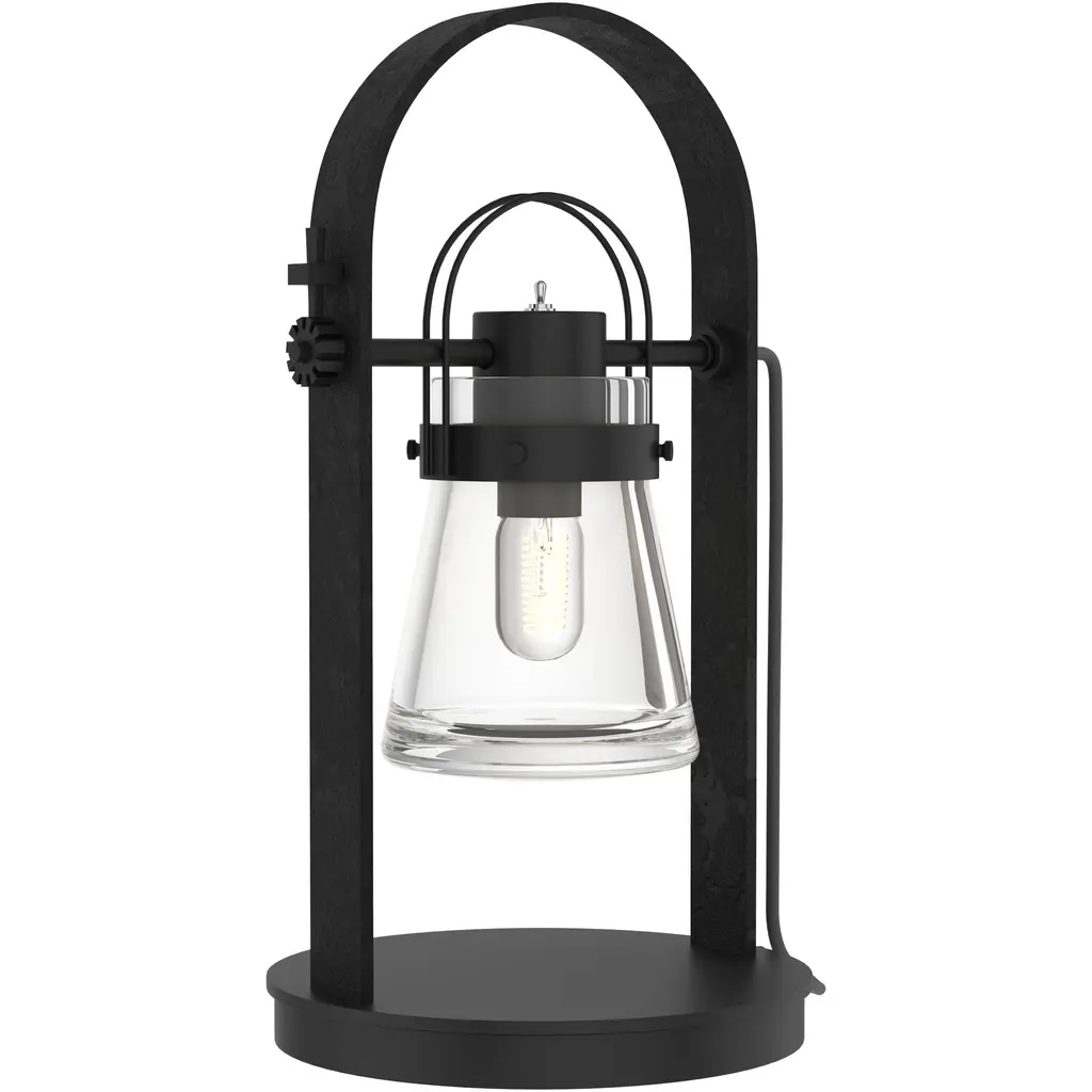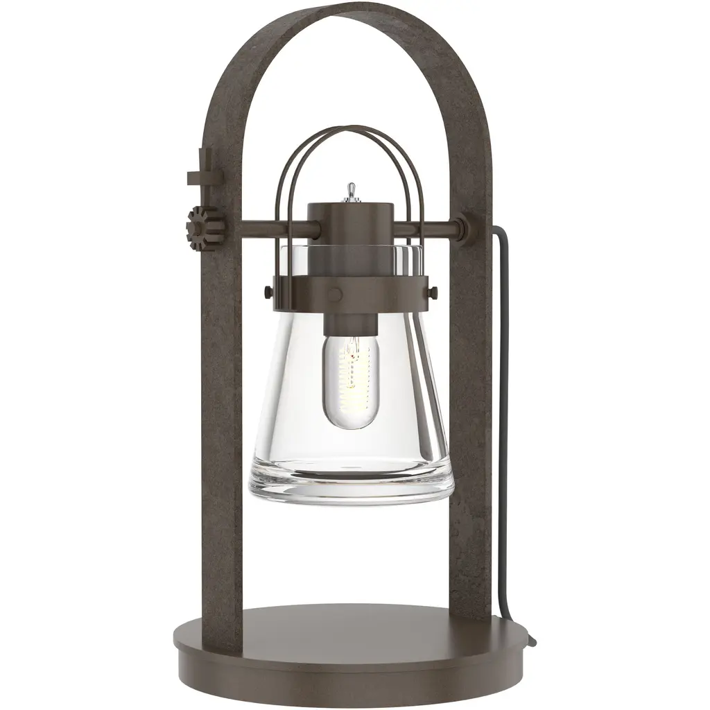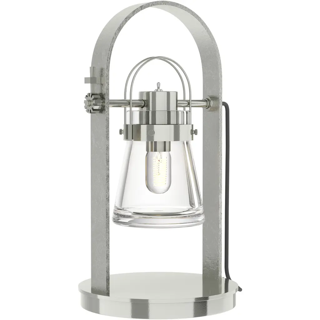 The clear, blown-glass flask of our Erlenmeyer Table Lamp is encircled by a handcrafted steel collar fixed to an arch within an arch. Angle can be adjusted with the steel cog locked by a steel pin - there's a touch of steampunk to the design.
