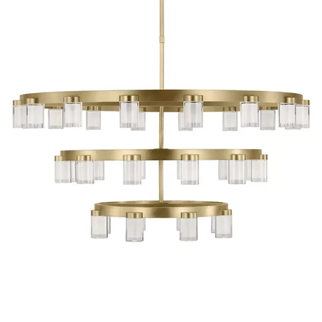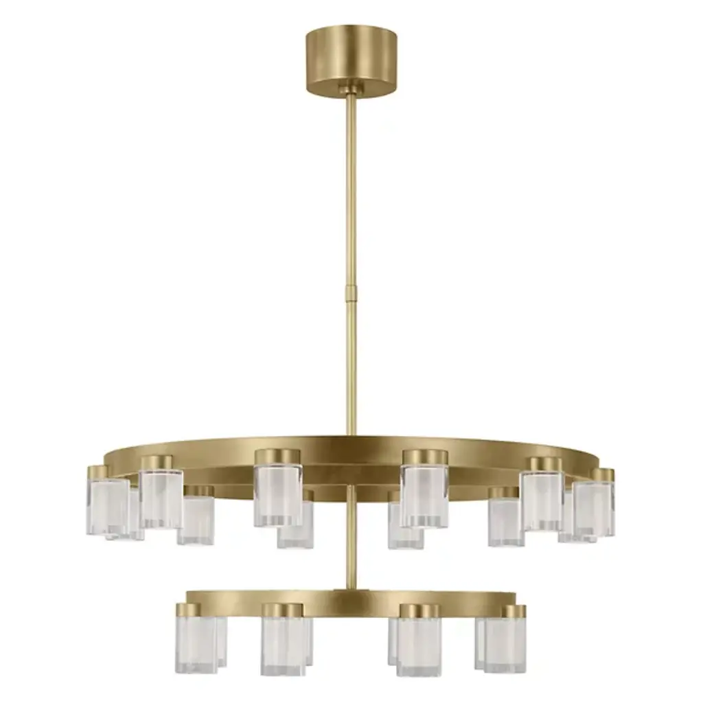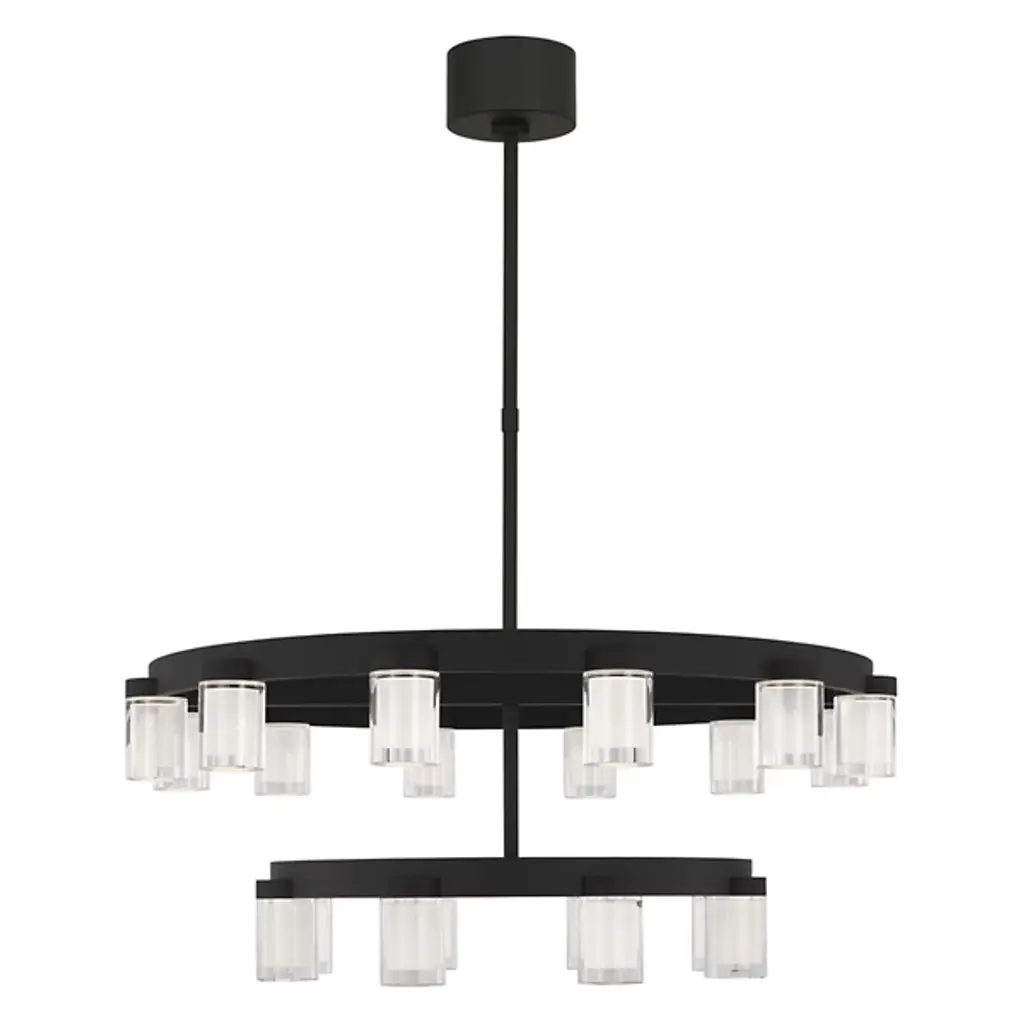 Enliven interiors with the layered contemporary character of the Esfera 2-Tier LED Chandelier from Visual Comfort Modern. A Kelly Wearstler creation, it sweeps down from a circular canopy, sending a slender central stem down through round ring structures below, placing an array of small but strong LED lamps around each outer edge. Each lamp is placed inside a small cylinder shade of glass, which moderates bright glare into an even glow that enlivens its surroundings.