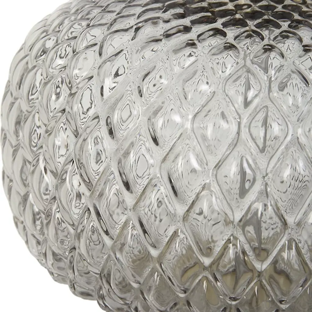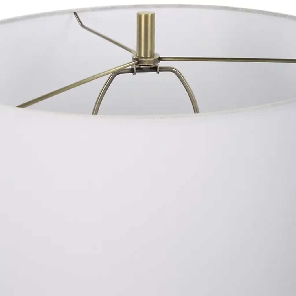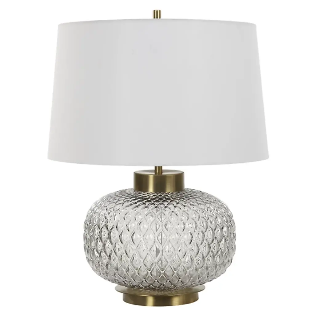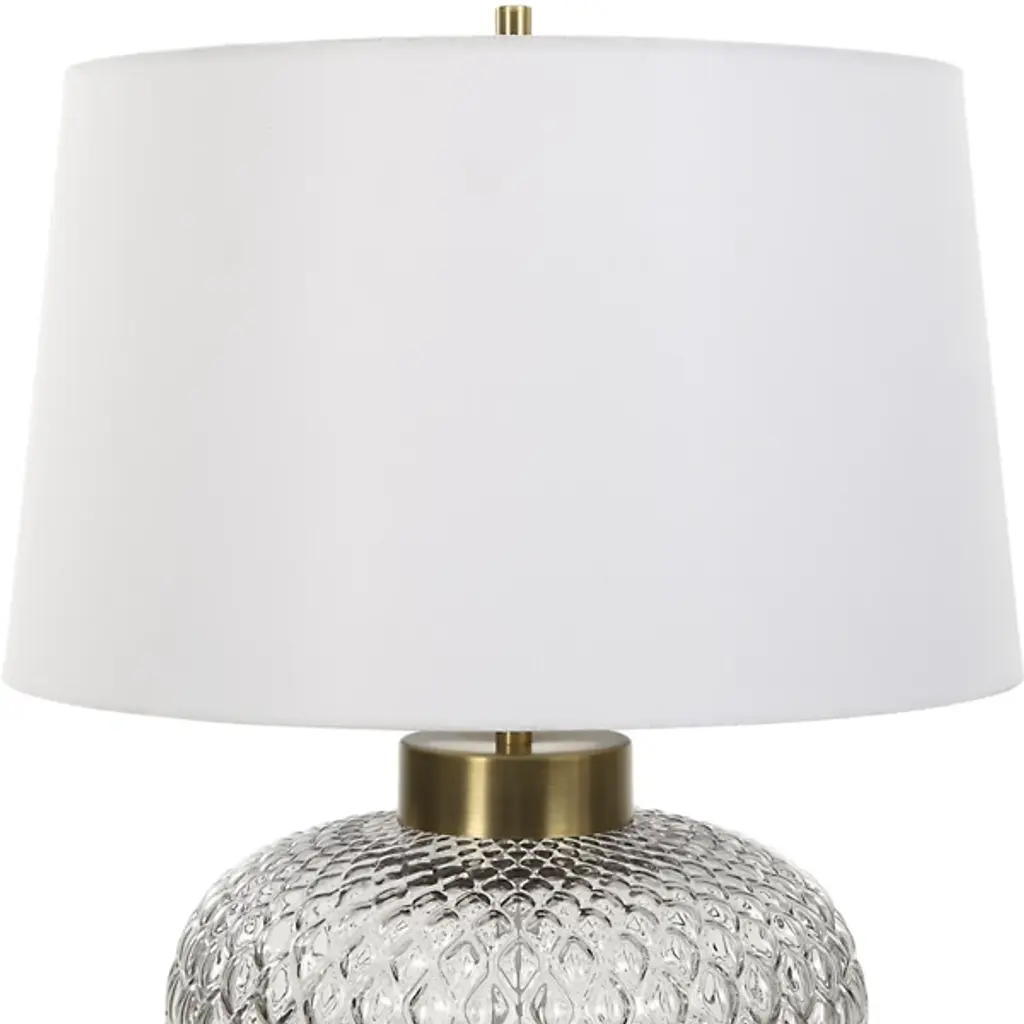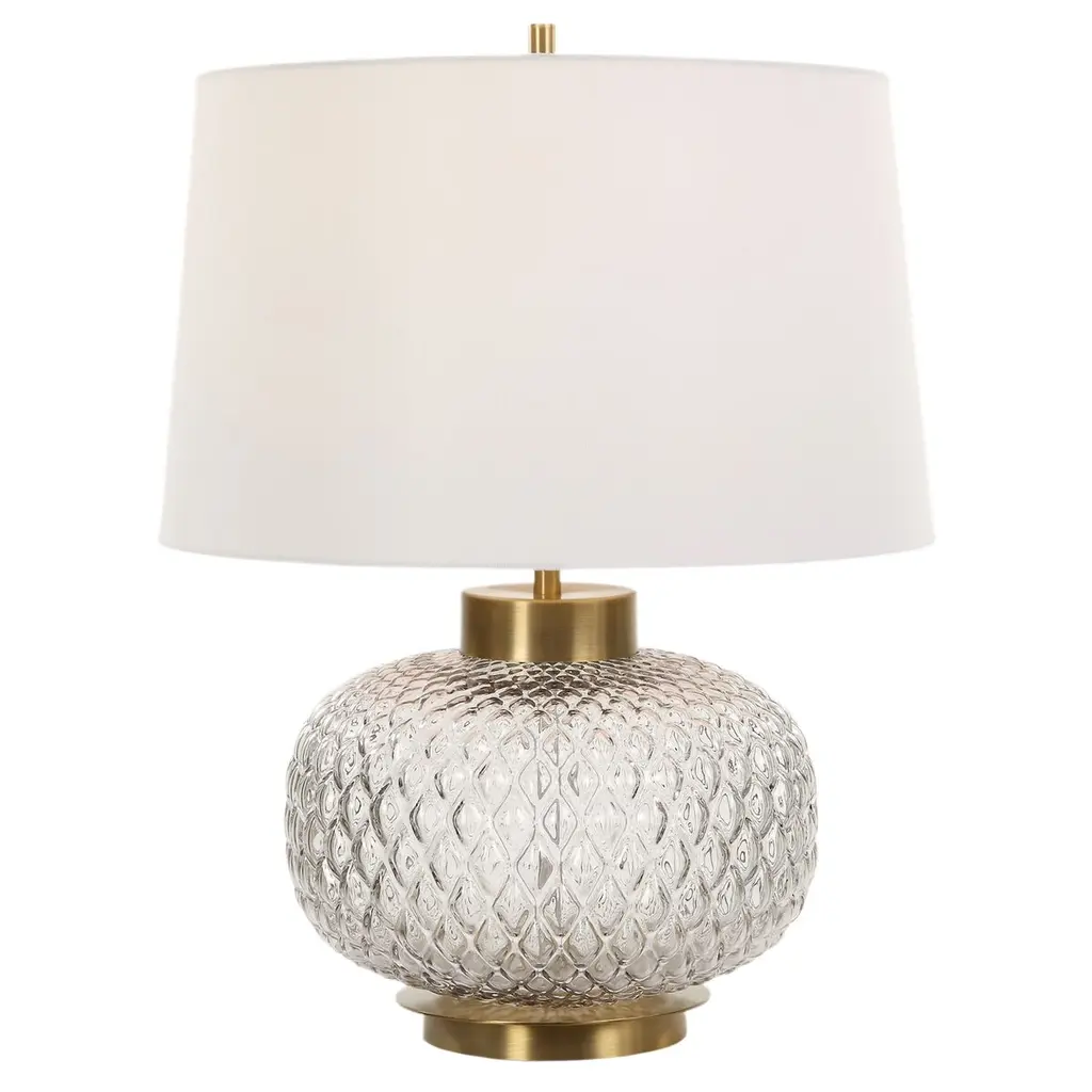 Introducing the Estelle Table Lamp from Uttermost, boasting a round lattice-inspired, light smoke-gray glass base adorned with intricate embossing. Complemented by a chunky antique brass foot and hardware, it exudes a blend of modernity and classic charm. Topped with a slightly tapered round hardback shade in crisp white linen fabric, this lamp radiates elegance. Elevate your space with its sophisticated design, offering both visual intrigue and warm illumination for any setting.