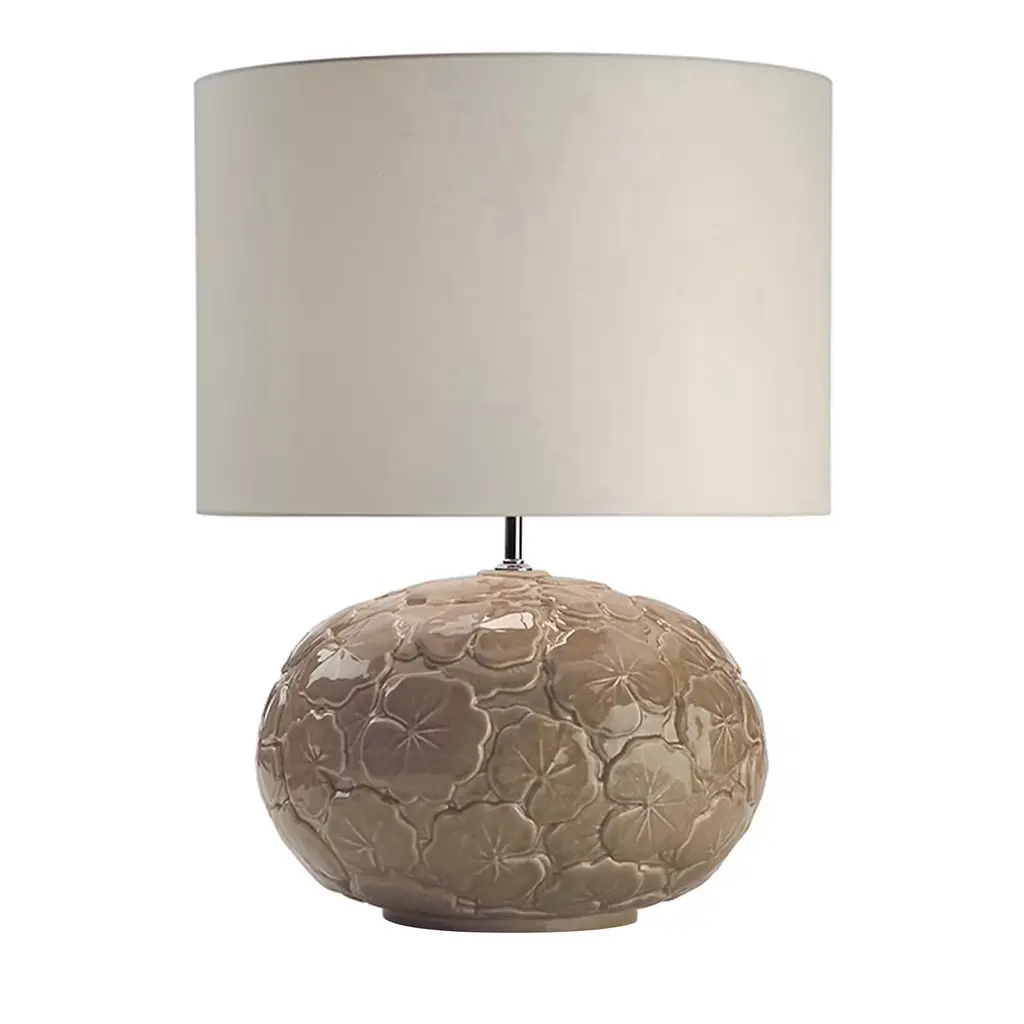 The Ethereal Blossoms Table Lamp seamlessly blends contemporary style and natural motifs. Crafted from glazed porcelain, the rounded lamp showcases a textural, hand-painted look with a variety of neutral tones overlain by wispy blue flowers. This three-way turnkey lamp features metal hardware in a Polished Nickel finish, matched by a plug finial.