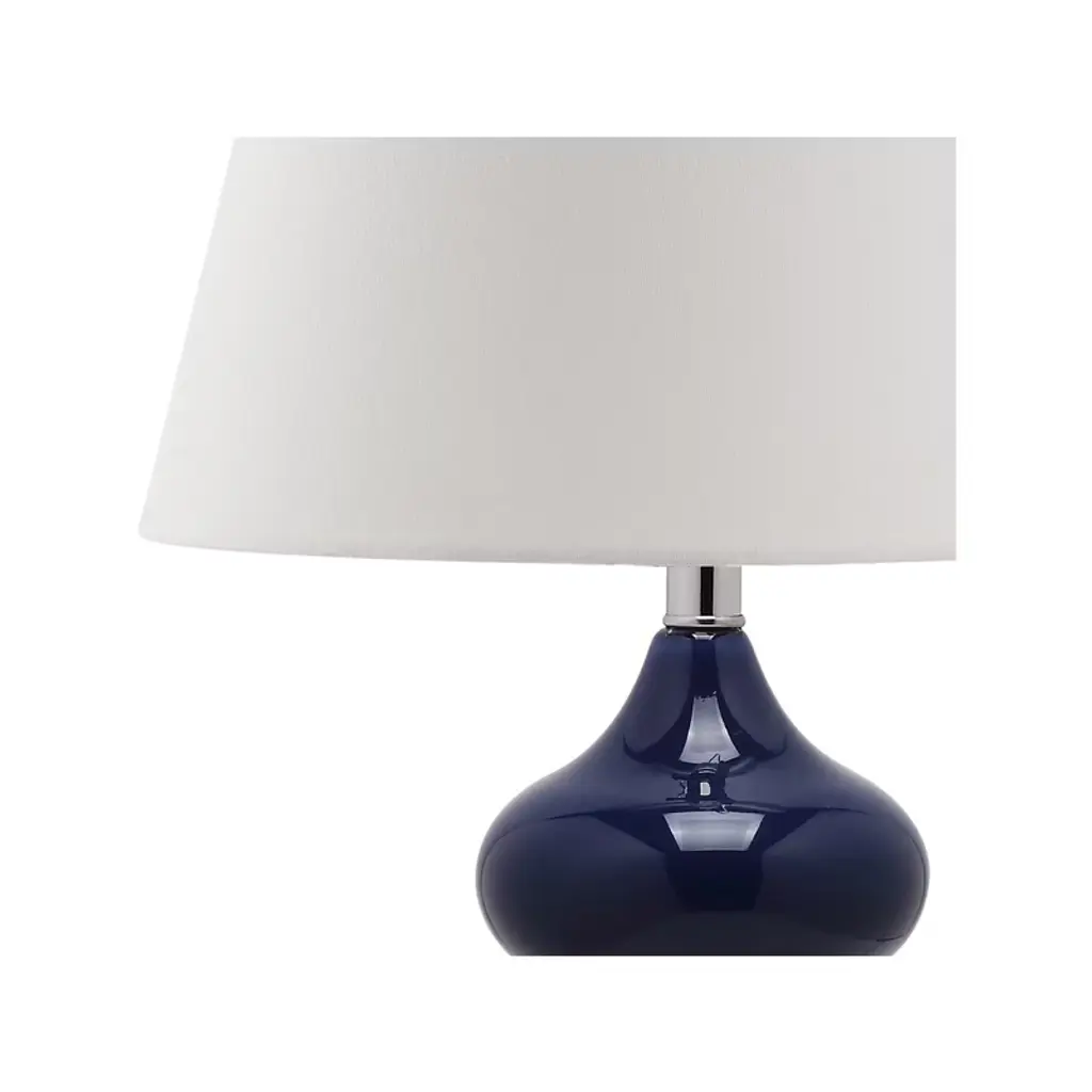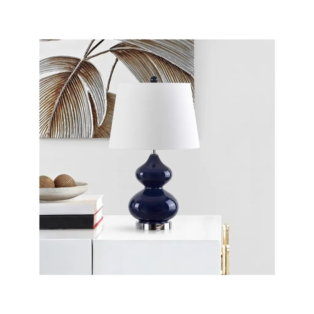 Illuminate your space with the captivating touch of the EVA double gourd table lamp. Standing at 24 inches, this navy glass lamp brings both style and functionality to any room. The stunning gourd shape creates a modern silhouette that complements a wide range of decor styles. Whether placed in a living room or bedroom, its elegant glass construction adds a sophisticated touch. The rich navy color subtly enhances the ambiance, making it a versatile addition to your home. Experience the perfect blend of design and practicality with this eye-catching table lamp, ready to brighten up your space with effortless charm.
