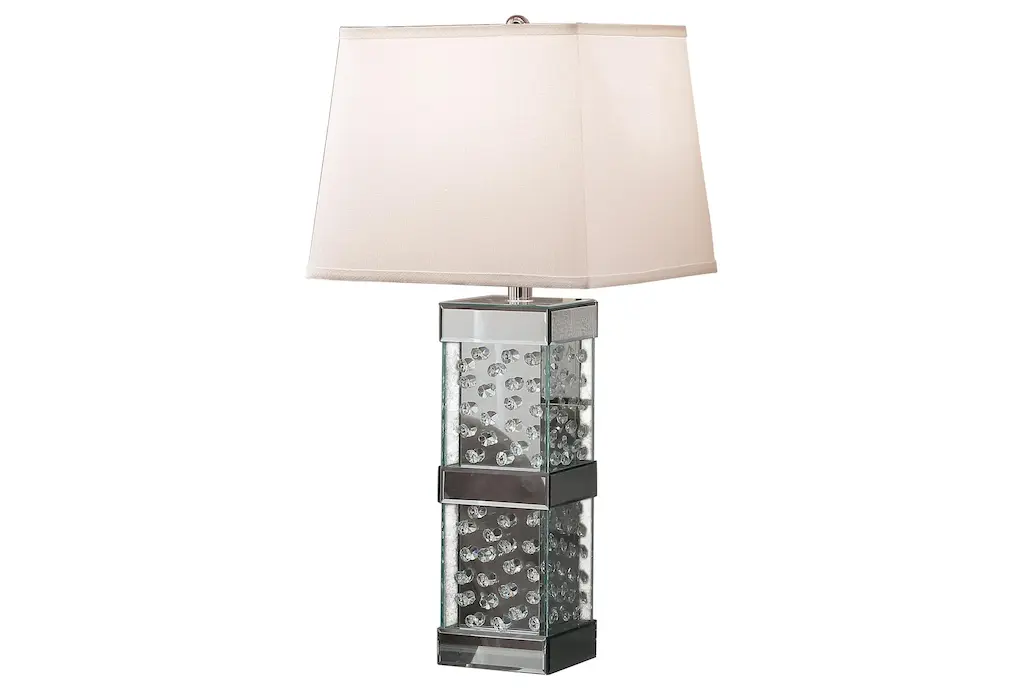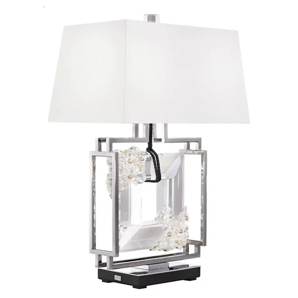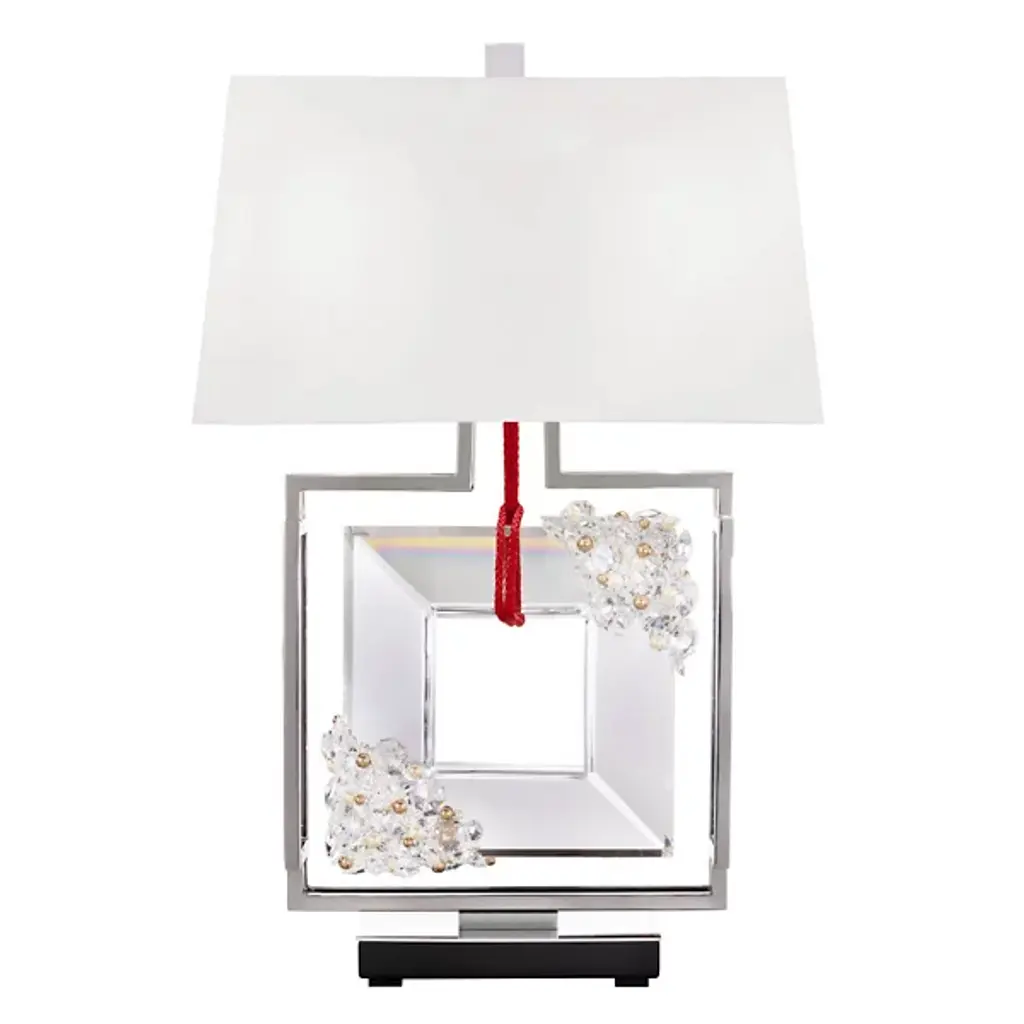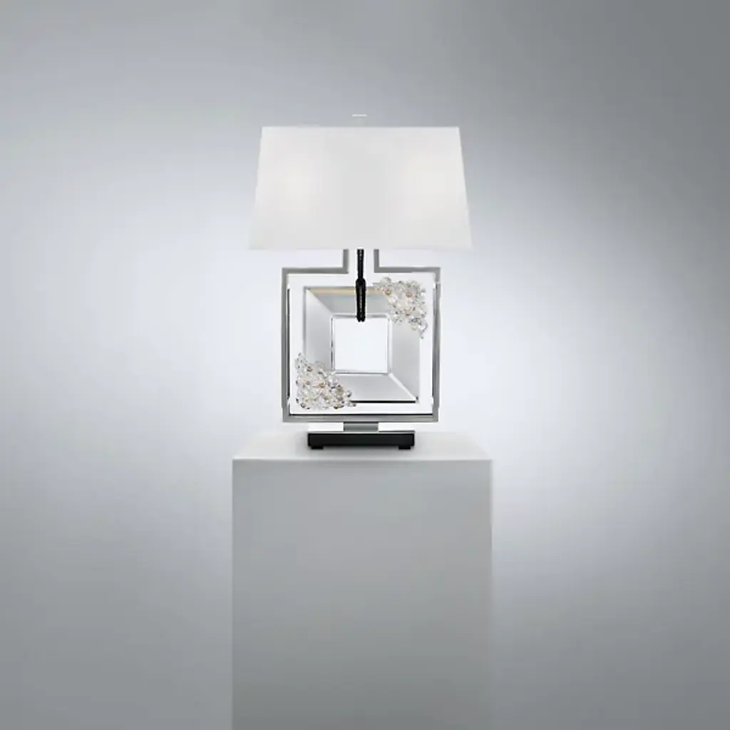 The Eva Table Lamp from Schonbek Forever features a flawless crystal square, framed by clusters of Schonbek Radiance crystals and lustrous pearls. This artful arrangement creates a mesmeric chemistry of light, with each facet reflecting and refracting LED illumination in a graceful dance of color. The lamp's steel and aluminum frame provides stability, while the optic crystal decoration within adds depth and sophistication. Topped with a luxurious fabric shade, this fixture fills the room with high-quality light to match its elegance.