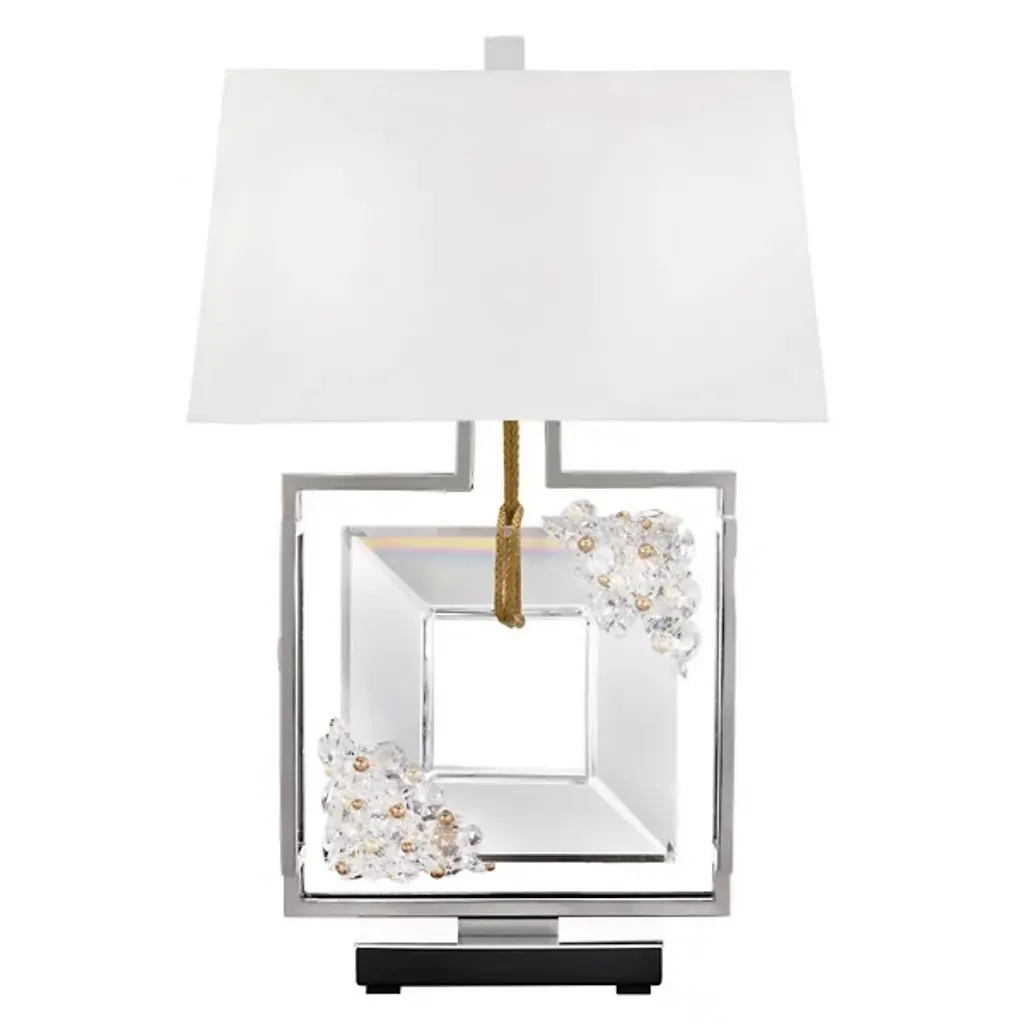The Eva Table Lamp from Schonbek Forever features a flawless crystal square, framed by clusters of Schonbek Radiance crystals and lustrous pearls. This artful arrangement creates a mesmeric chemistry of light, with each facet reflecting and refracting LED illumination in a graceful dance of color. The lamp's steel and aluminum frame provides stability, while the optic crystal decoration within adds depth and sophistication. Topped with a luxurious fabric shade, this fixture fills the room with high-quality light to match its elegance.