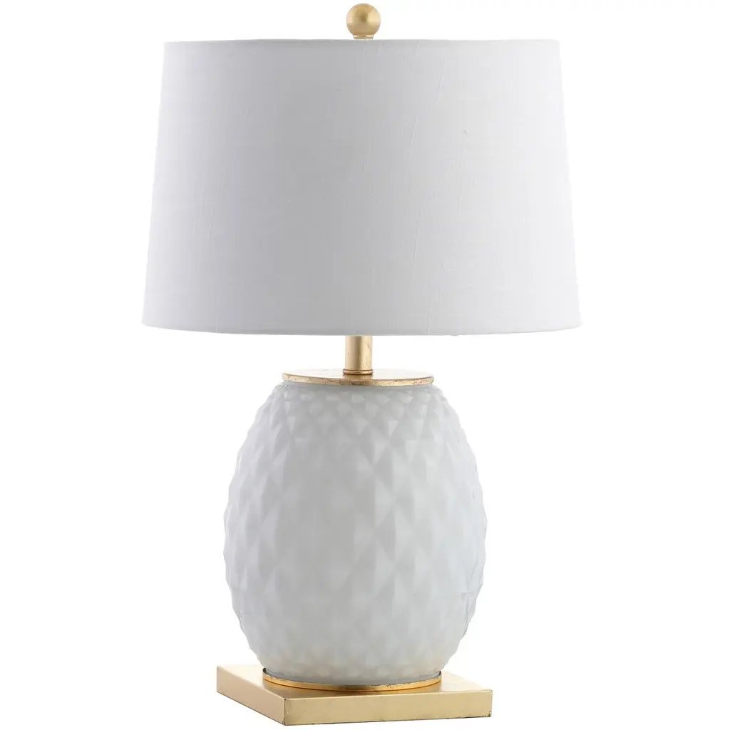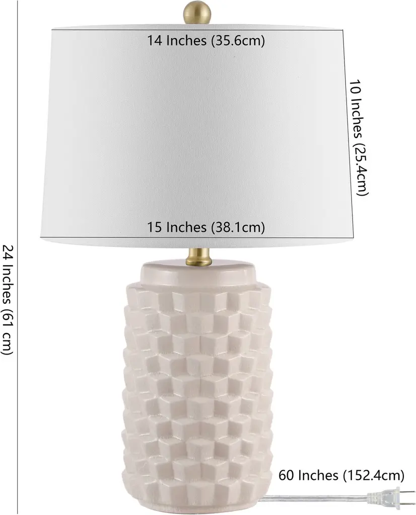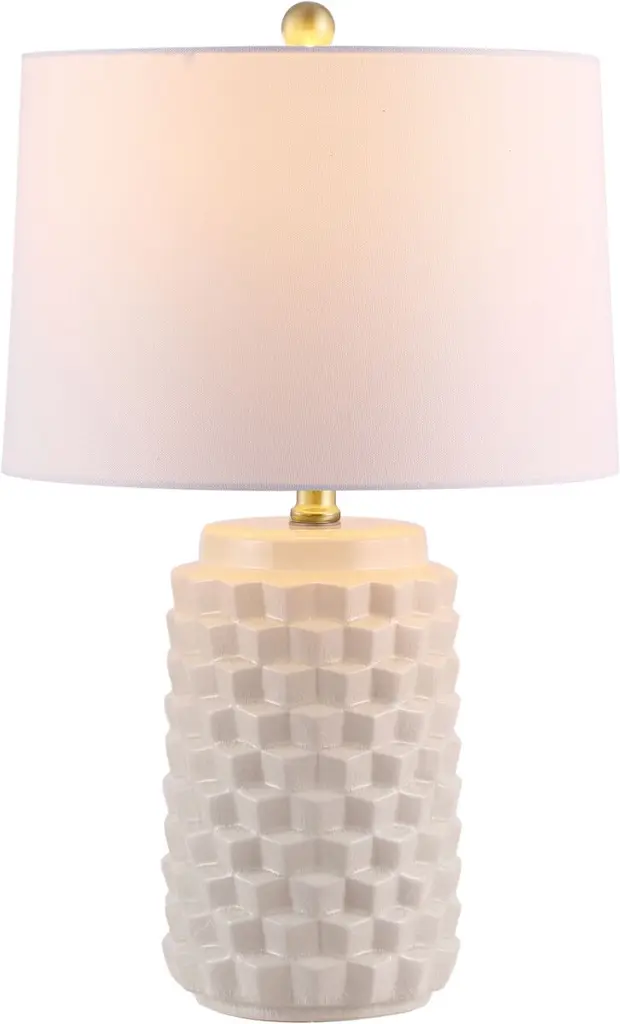 This midcentury-inspired table lamp features a geometric ceramic base that commands attention with its glossy finish. The elegant design is completed with a cotton shade and a refined finial, adding a touch of timeless sophistication to any space.