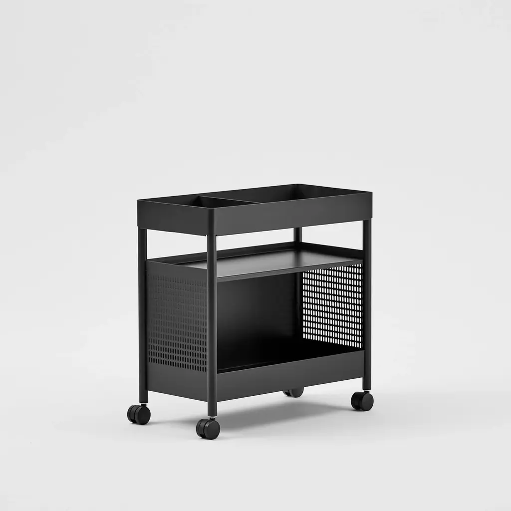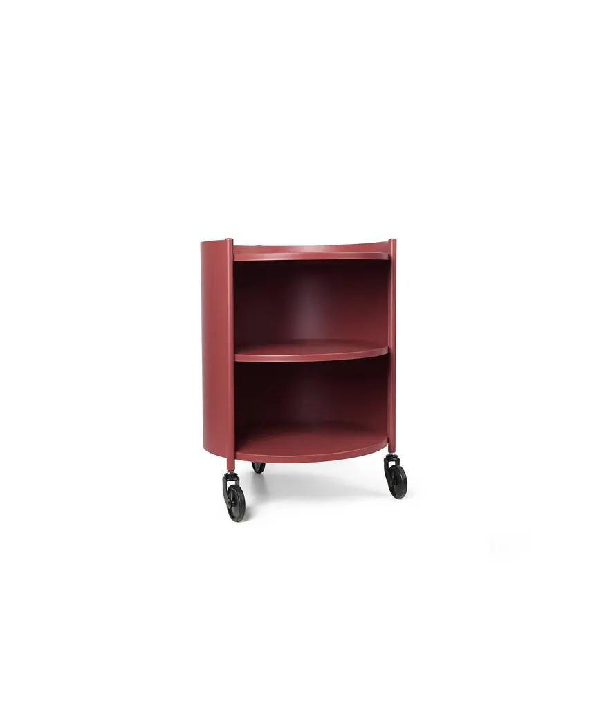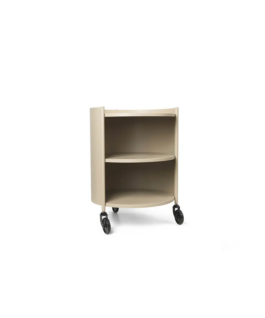 Defined by its appealing cylinder shape and three large wheels, the Eve Storage is a versatile piece made from durable, powder-coated steel with three shelves, two of which are partially hidden behind the sleek frame. Place a table lamp on the top shelf and use the Eve Storage as a practical bedside table, use it in the living room as a stylish side table or in the office to store your essentials. The functional wheels make it convenient to move the Eve Storage from one room to another, making it easy to fulfill all of your storage needs. Designed and produced by the Copenhagen-based studio Ferm Living.
