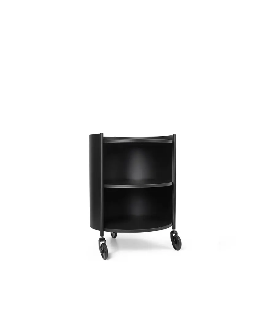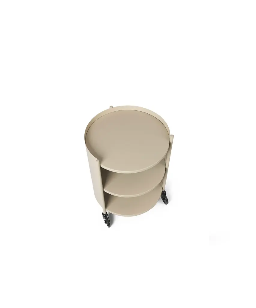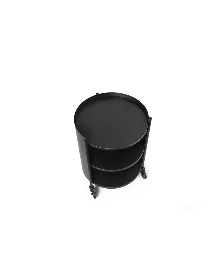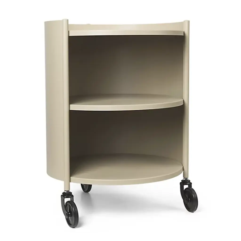 Defined by its appealing cylinder shape and three large wheels, the Eve Storage is a versatile piece made from durable, powder-coated steel with three shelves, two of which are partially hidden behind the sleek frame. Place a table lamp on the top shelf and use the Eve Storage as a practical bedside table, use it in the living room as a stylish side table or in the office to store your essentials. The functional wheels make it convenient to move the Eve Storage from one room to another, making it easy to fulfill all of your storage needs. Designed and produced by the Copenhagen-based studio Ferm Living.