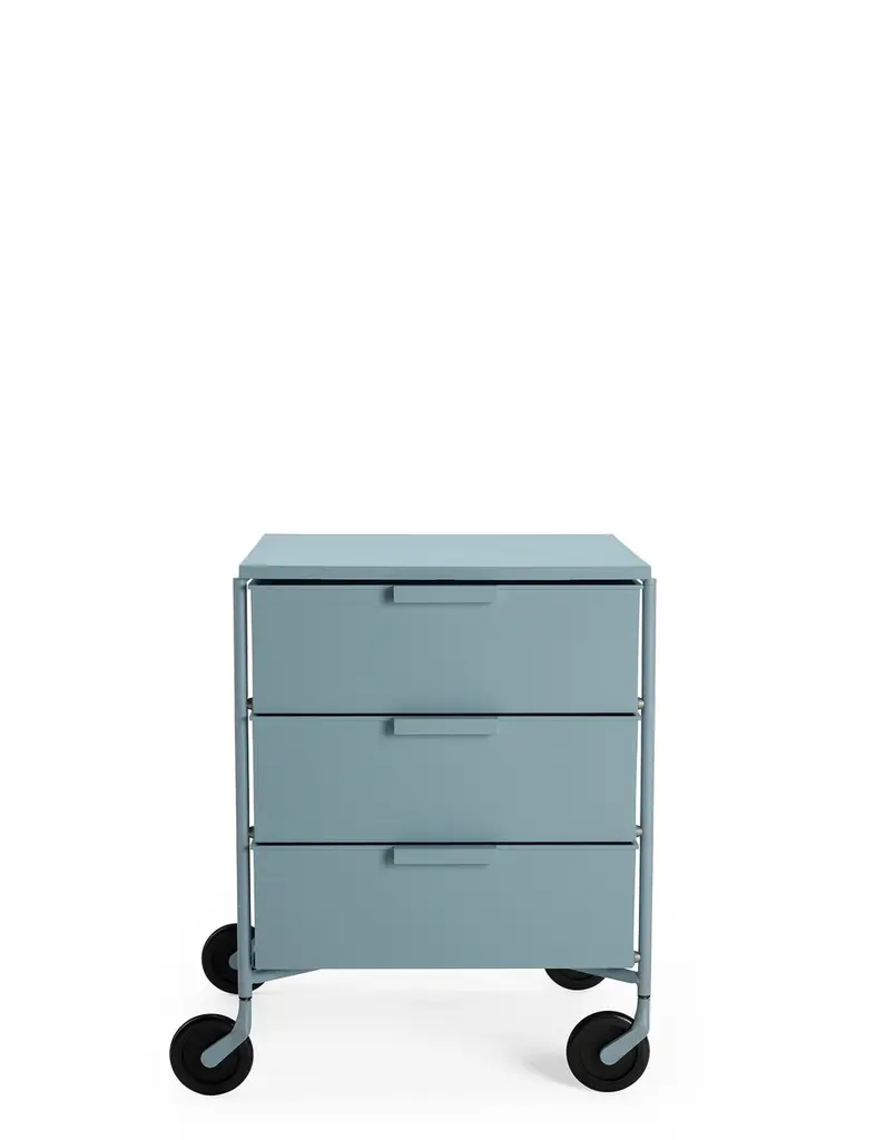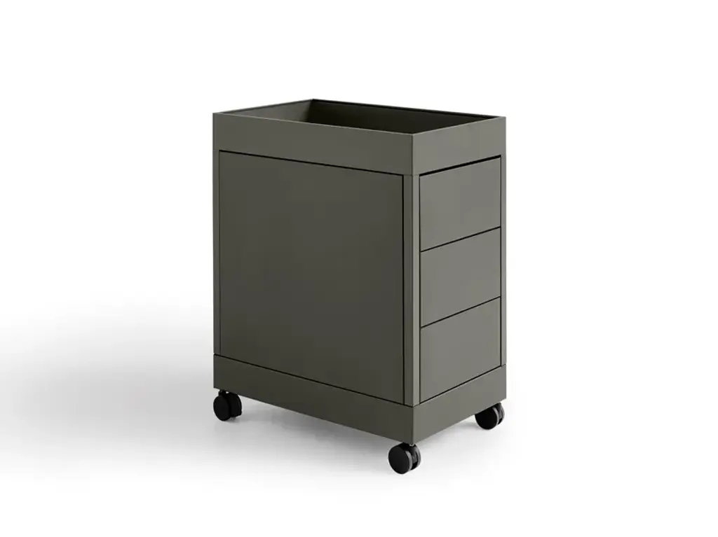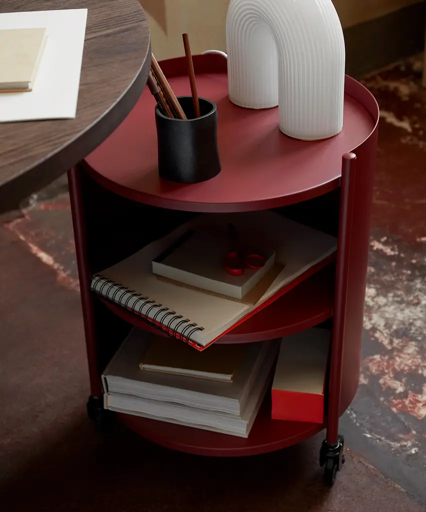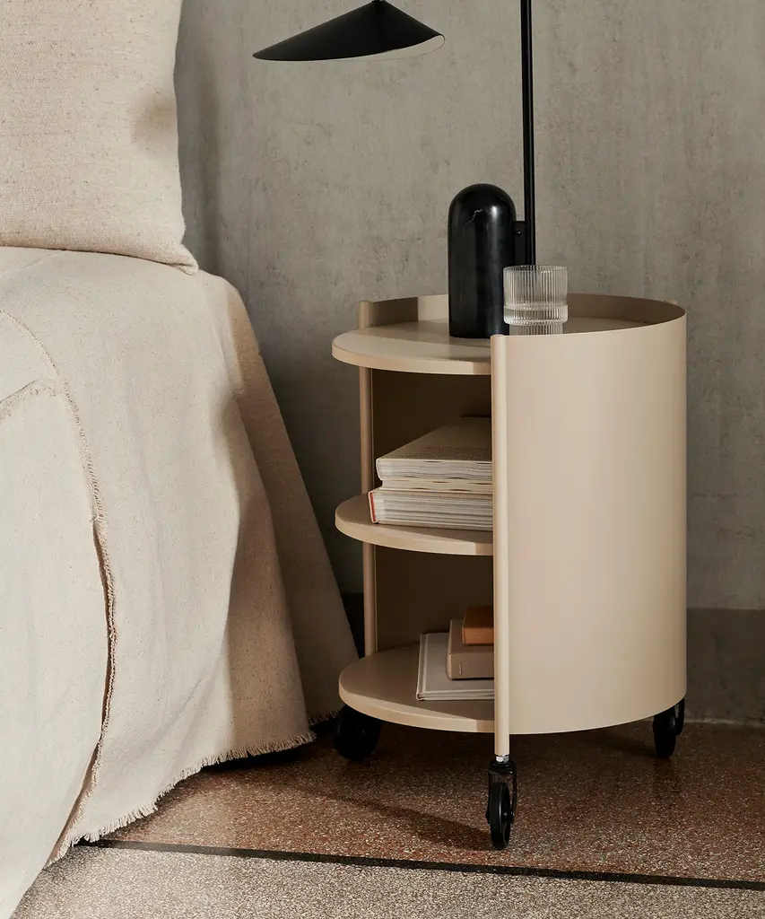 Defined by its appealing cylinder shape and three large wheels, the Eve Storage is a versatile piece made from durable, powder-coated steel with three shelves, two of which are partially hidden behind the sleek frame. Place a table lamp on the top shelf and use the Eve Storage as a practical bedside table, use it in the living room as a stylish side table or in the office to store your essentials. The functional wheels make it convenient to move the Eve Storage from one room to another, making it easy to fulfill all of your storage needs. Designed and produced by the Copenhagen-based studio Ferm Living.