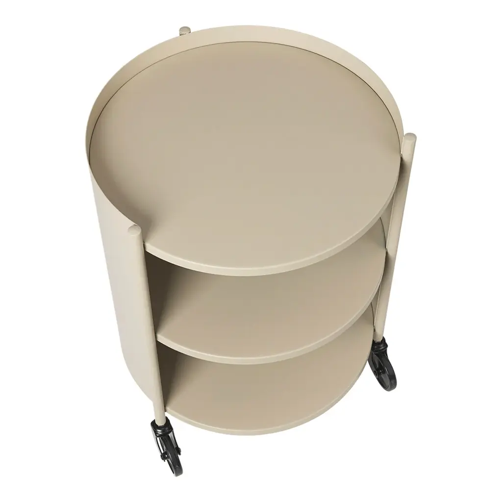 Defined by its appealing cylinder shape and three large wheels, the Eve Storage is a versatile piece made from durable, powder-coated steel with three shelves, two of which are partially hidden behind the sleek frame. Place a table lamp on the top shelf and use the Eve Storage as a practical bed side table, use it in the living room as a stylish side table or in the office to store your essentials. The functional wheels make it convenient to move the Eve Storage from one room to another, making it easy to fulfil all of your storage needs.