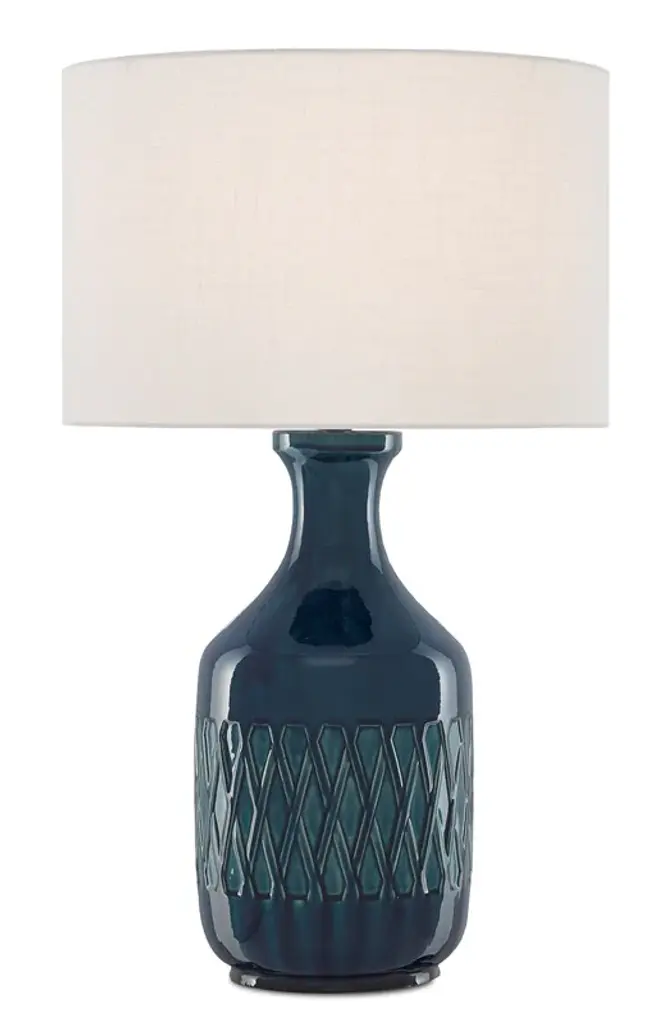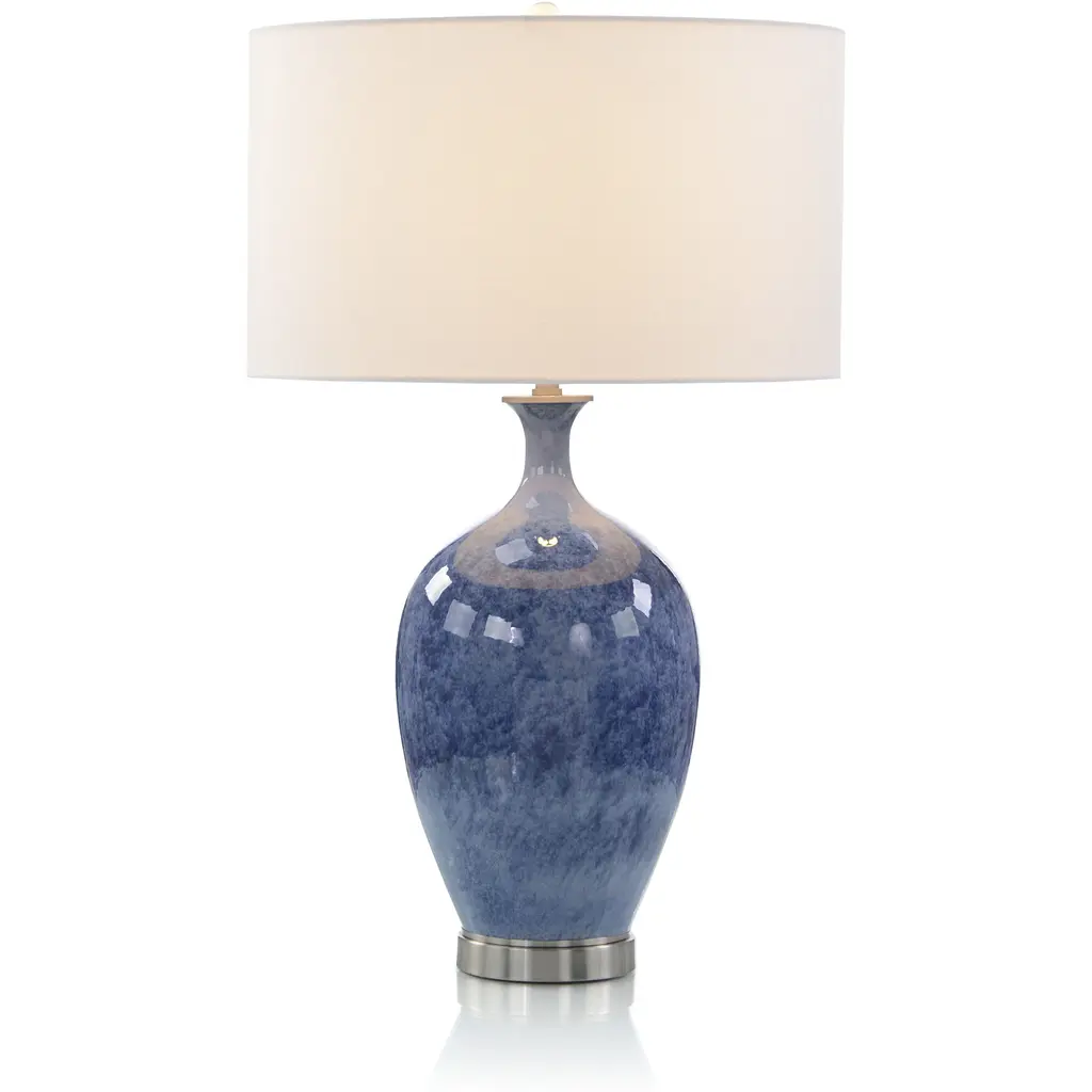 A deep, romantic shade of blue permeates the body of the Eventide Table Lamp. Peeking out from beneath the dark hues are faint, wispy streaks of white that reminisce of a cool breeze flowing in the night. The piece is finished with a soft glossy sheen, accentuating the curvaceous body and beautifully complementing the circular base of brushed stainless steel with and matching finial.