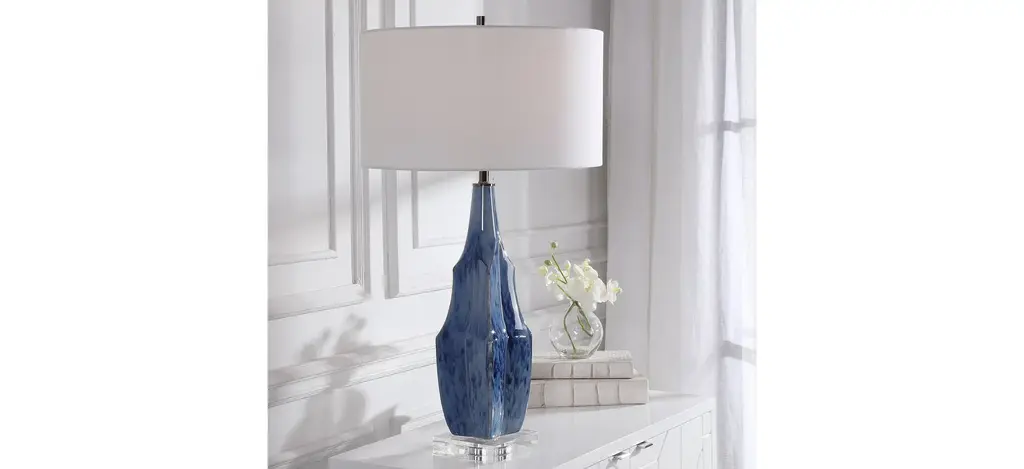 This ceramic table lamp is finished in a beautiful reactive indigo blue glaze, accented by elegant polished nickel and crystal details. A white linen fabric drum shade completes the look.
