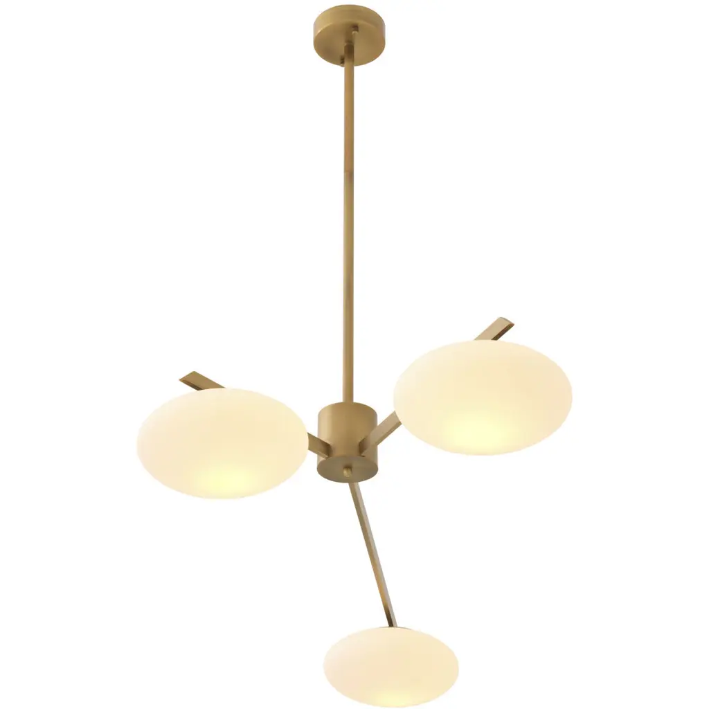 Add a dash of Mid-Century Modern style to your home with the small Evergreen Chandelier. A highlight in any room, this 3-light sputnik chandelier features a striking silhouette. Provided with an antique brass finish, this statement lighting piece contains six elliptical lampshades of white glass. The fixture is supplied with 3 stems in different lengths, so you can use it as a semi-flush mount ceiling light or a pendant light.