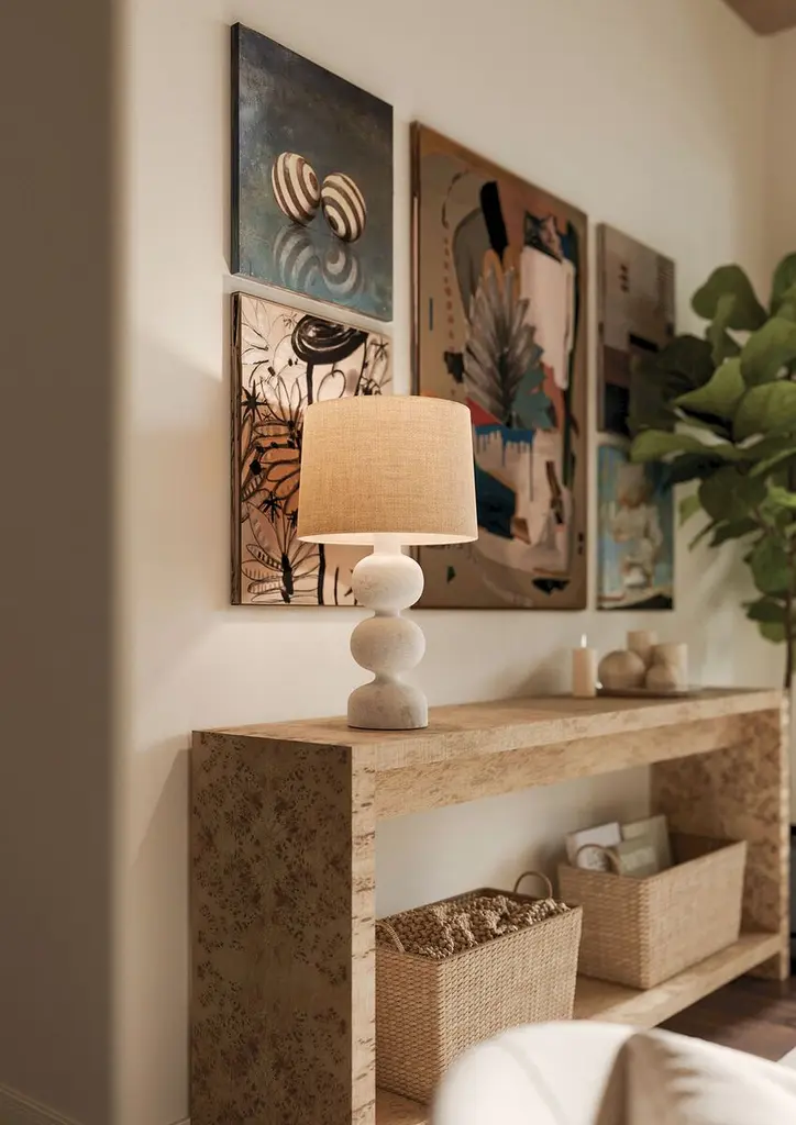 The Evric table lamp makes a totemic statement with softly organic, stacked geometry. The shapely base, resembling a paper mache-like material, expresses a highly tactile surface quality. This texture is further enhanced by a natural jute shade with a rustic, earthy edge. Due to the one-of-a-kind nature of the medium, exact colors and patterns may vary slightly from the image shown.