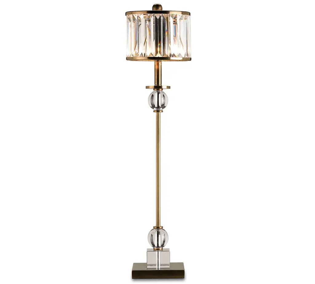 This lighting is all charm and sweetness. The Fairlane Table Lamp features a whimsical crystal shade on a slender antique-brass column detailed with round crystals. For a playful contrast, it sits on a layered geometric base.