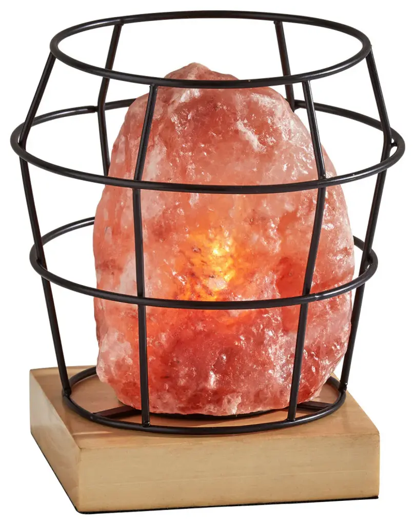 Create a calming atmosphere in your home with the Hope Himalayan Salt Table Lamp. This salt lamp is not like other salt lamps that feature only the bare salt rock. This lamp features an industrial styled black metal wire cage around the rock and sits atop a natural wood base, adding a decorative accent to any room.Crafted from 100% natural Himalayan salt crystals, this lamp emits a warm, soothing glow while also providing benefits improving health and wellness. By releasing negative ions into the surrounding air, this lamp can purify the air quality, help boost mood and improve sleeping habits. All Adesso lighting product is either UL or ETL listed, meaning that it has been tested and approved to meet the government-regulated safety standards for the USA. A 7W incandescant bulb is included with this shipment.