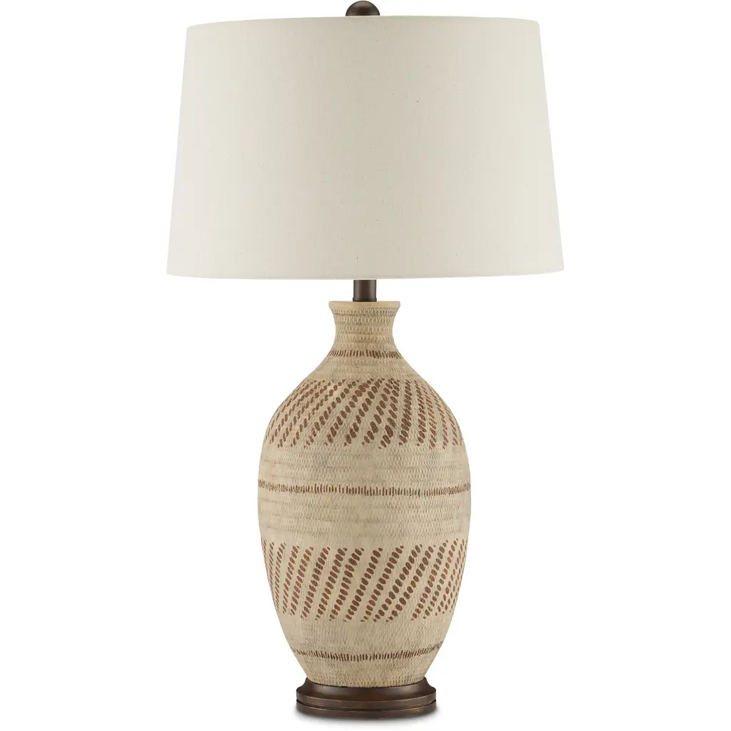 The earthen basket-weave texture of the Faiyum Table Lamp enlivens its classic pottery form to make it appear it is a wrapped confection of texture. The effect is created then the terracotta is glazed in tan and brown hues to hint at a woven pattern. The hand-rubbed bronze hardware and the flax linen shade blend perfectly with the tones in the lamp, which stands 31 inches tall.