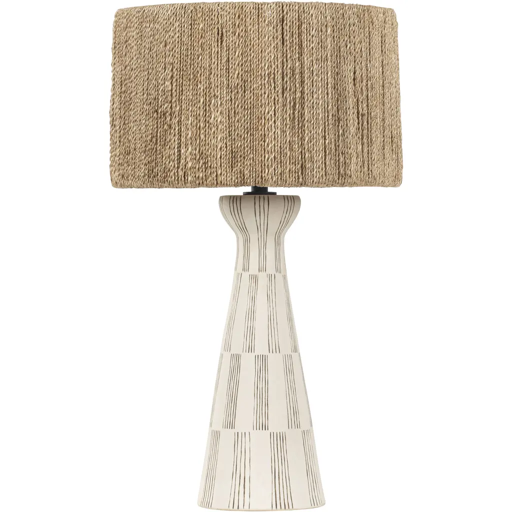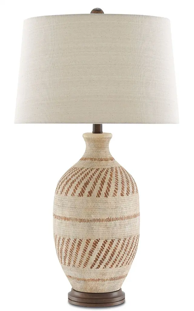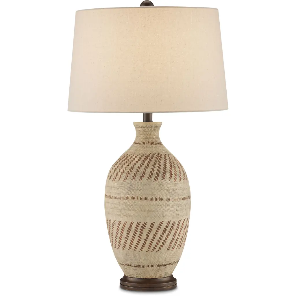 The basket-weave surface of the terracotta lamp, the hand-rubbed bronze finish of the metal, and the linen shade make this table lamp a textural delight.